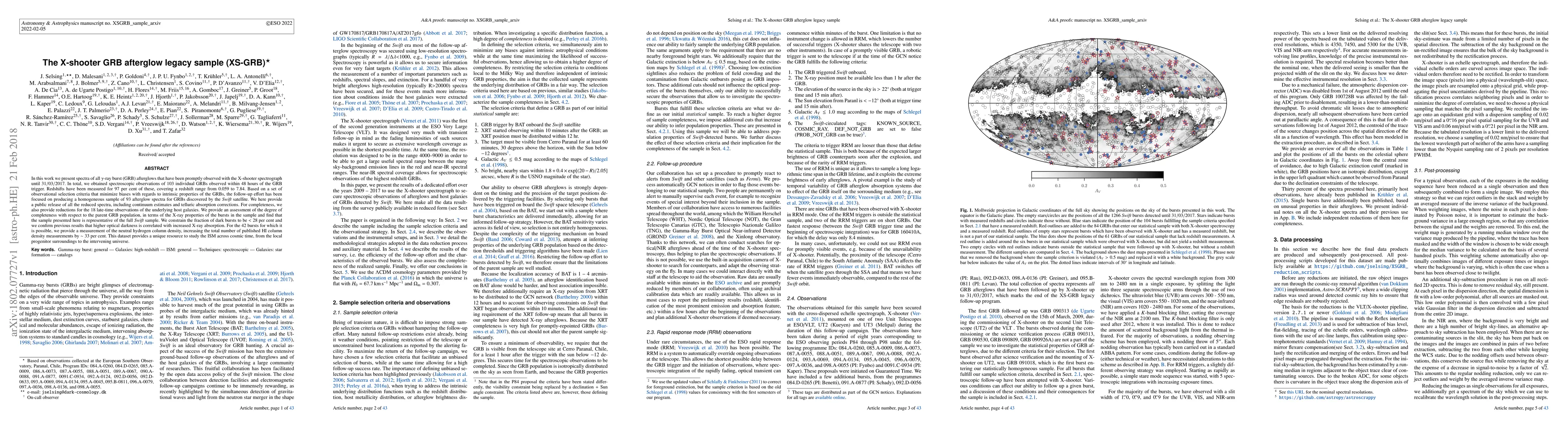 In this work we present spectra of all $\gamma$-ray burst (GRB) afterglows that have been promptly observed with the X-shooter spectrograph until 31-03-2017. In total, we obtained spectroscopic observations of 103 individual GRBs observed within 48 hours of the GRB trigger. Redshifts have been measured for 97 per cent of these, covering a redshift range from 0.059 to 7.84. Based on a set of observational selection criteria that minimize biases with regards to intrinsic properties of the GRBs, the follow-up effort has been focused on producing a homogeneous sample of 93 afterglow spectra for GRBs discovered by the Swift satellite. We here provide a public release of all the reduced spectra, including continuum estimates and telluric absorption corrections. For completeness, we also provide reductions for the 18 late-time observations of the underlying host galaxies. We provide an assessment of the degree of completeness with respect to the parent GRB population, in terms of the X-ray properties of the bursts in the sample and find that the sample presented here is representative of the full Swift sample. We constrain the fraction of dark bursts to be < 28 per cent and we confirm previous results that higher optical darkness is correlated with increased X-ray absorption. For the 42 bursts for which it is possible, we provide a measurement of the neutral hydrogen column density, increasing the total number of published HI column density measurements by $\sim$ 33 per cent. This dataset provides a unique resource to study the ISM across cosmic time, from the local progenitor surroundings to the intervening universe.