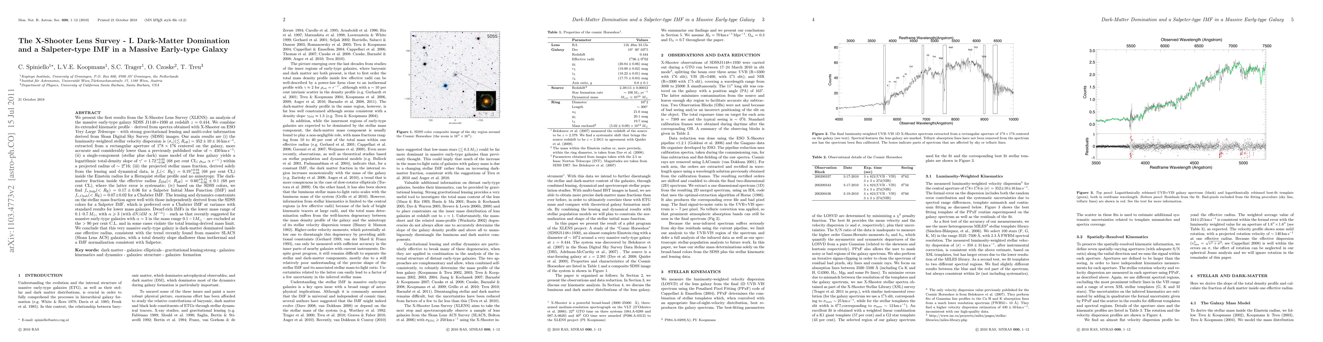 The X-Shooter Lens Survey reveals that the massive early-type galaxy SDSS J1148+1930 is dark-matter dominated within its effective radius, with a stellar velocity dispersion of 351±10 km/s. The analysis favors a Salpeter Initial Mass Function over Chabrier, indicating a higher stellar mass fraction.