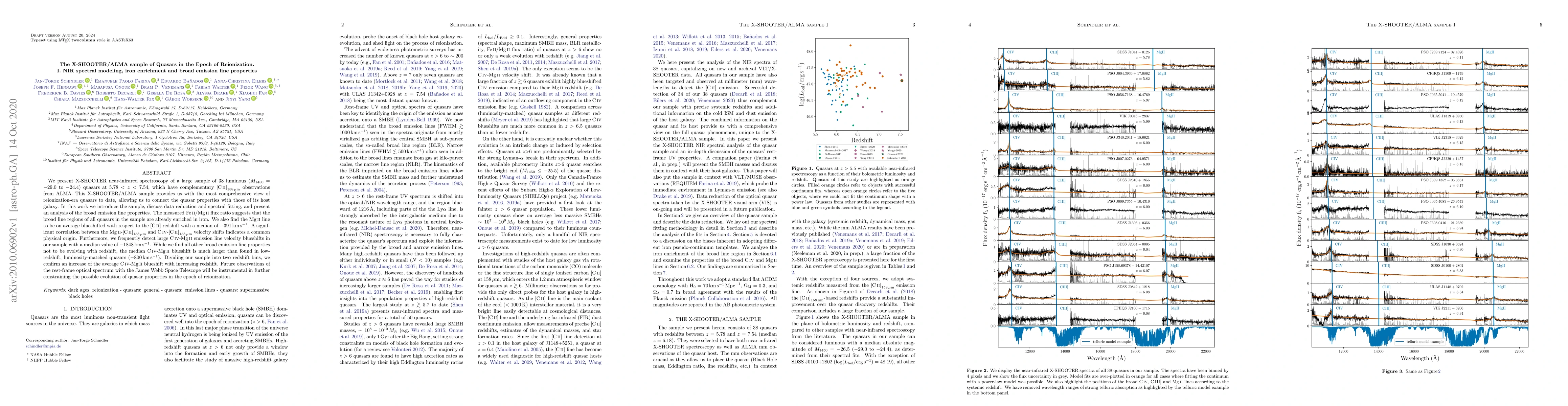 This paper presents X-SHOOTER near-infrared spectroscopy of a sample of 38 high-redshift quasars, complemented by ALMA observations, revealing iron enrichment in their broad line regions and significant blueshifts in emission lines. The study finds a correlation between MgII-CII and CIV-CII velocity shifts, suggesting a common physical origin.