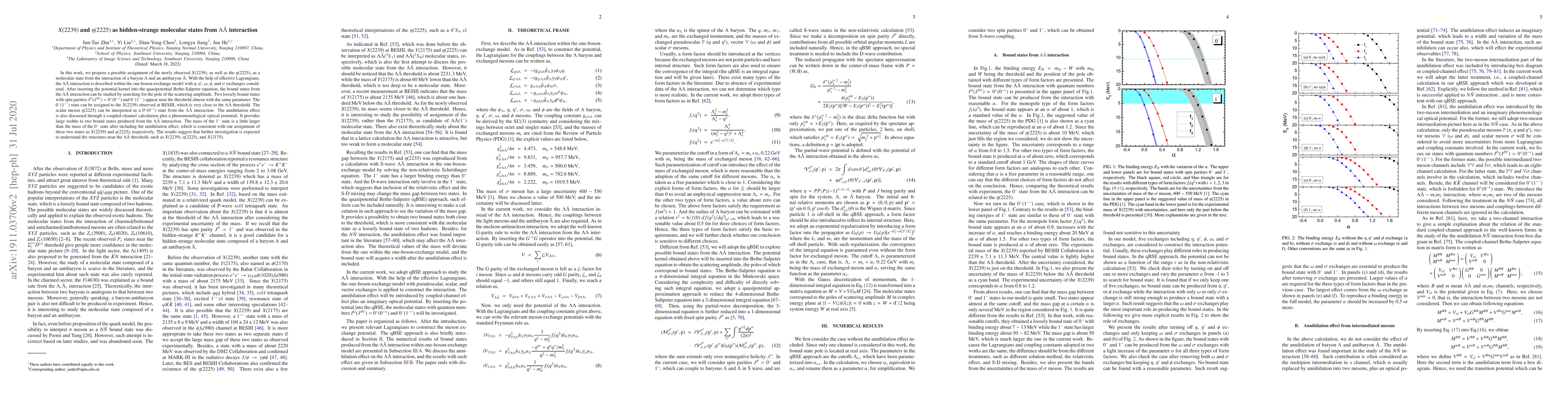 This research proposes the $X(2239)$ and $eta(2225)$ as molecular states from the interaction of $Lambda$ and $ar{Lambda}$. Using effective Lagrangians and the Bethe-Salpeter equation, two bound states with spin parities $0^-(1^{-+})$ and $0^+(0^{-+})$ are found near the $Lambdaar{Lambda}$ threshold. The $0^-(1^{-+})$ state is assigned to $X(2239)$, and the $0^+(0^{-+})$ to $eta(2225)$, supporting further study of structures near the $Lambdaar{Lambda}$ threshold.