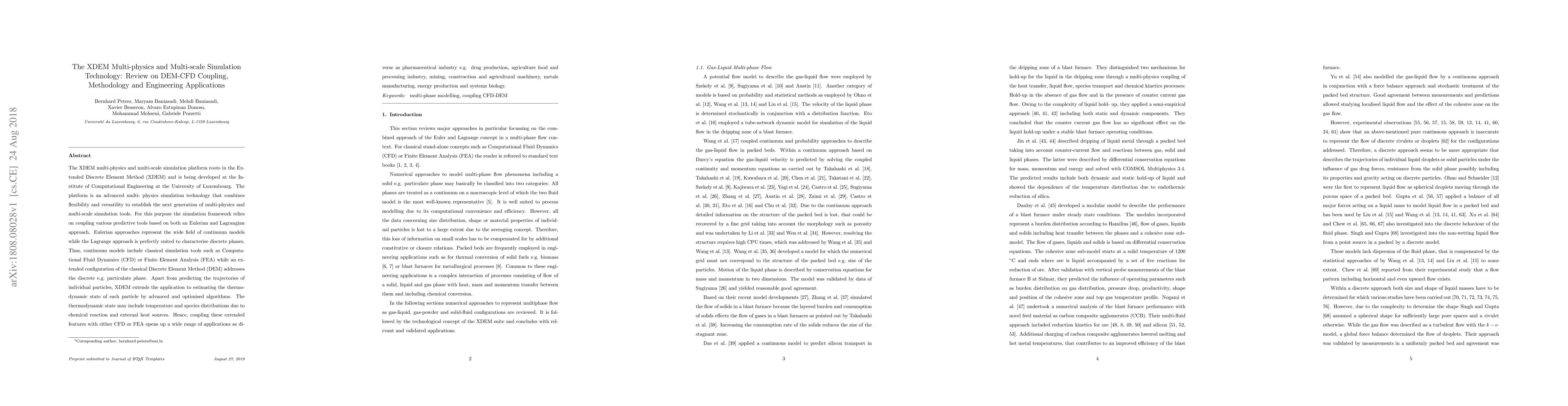 The XDEM multi-physics and multi-scale simulation platform roots in the Ex- tended Discrete Element Method (XDEM) and is being developed at the In- stitute of Computational Engineering at the University of Luxembourg. The platform is an advanced multi- physics simulation technology that combines flexibility and versatility to establish the next generation of multi-physics and multi-scale simulation tools. For this purpose the simulation framework relies on coupling various predictive tools based on both an Eulerian and Lagrangian approach. Eulerian approaches represent the wide field of continuum models while the Lagrange approach is perfectly suited to characterise discrete phases. Thus, continuum models include classical simulation tools such as Computa- tional Fluid Dynamics (CFD) or Finite Element Analysis (FEA) while an ex- tended configuration of the classical Discrete Element Method (DEM) addresses the discrete e.g. particulate phase. Apart from predicting the trajectories of individual particles, XDEM extends the application to estimating the thermo- dynamic state of each particle by advanced and optimised algorithms. The thermodynamic state may include temperature and species distributions due to chemical reaction and external heat sources. Hence, coupling these extended features with either CFD or FEA opens up a wide range of applications as diverse as pharmaceutical industry e.g. drug production, agriculture food and processing industry, mining, construction and agricultural machinery, metals manufacturing, energy production and systems biology.