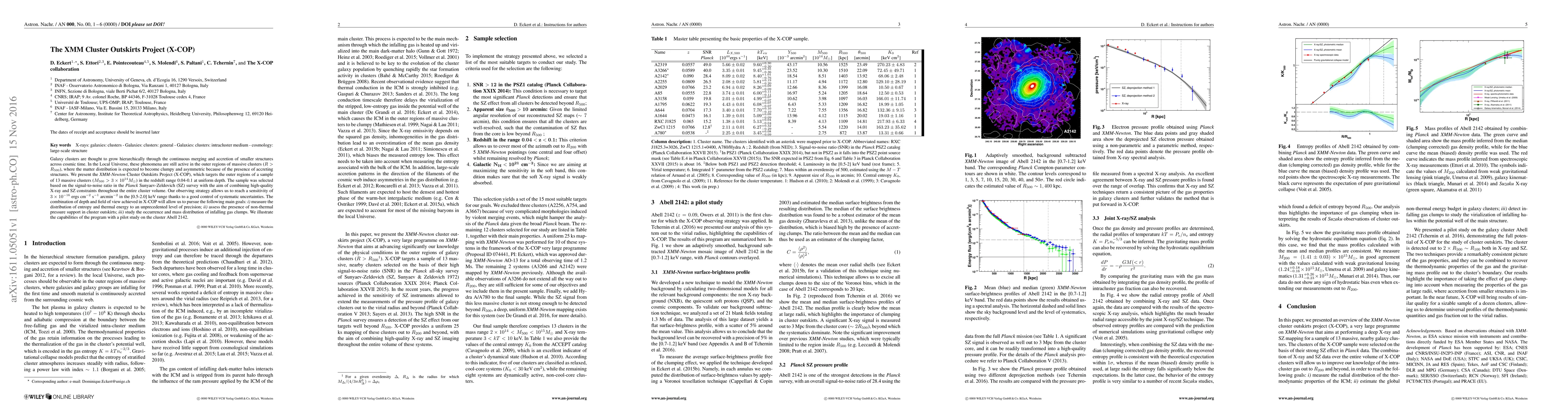 The XMM Cluster Outskirts Project (X-COP) investigates galaxy cluster growth through hierarchical mergers in the outer regions of massive clusters. The study aims to measure entropy and thermal energy distribution with unprecedented precision.