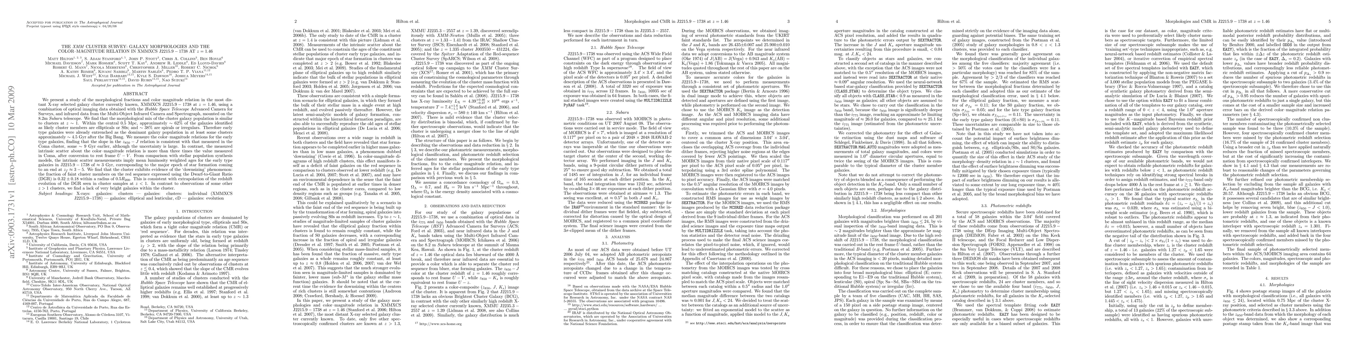 This study examines galaxy morphologies and the color-magnitude relation in the distant X-ray cluster XMMXCS J2215.9-1738 at z=1.46, revealing a similar morphological mix to clusters at z~1, with ~62% ellipticals/S0s and ~38% spirals/irregulars. The cluster exhibits a `downsizing' phenomenon and a higher intrinsic scatter in the color-magnitude relation compared to the Coma cluster.