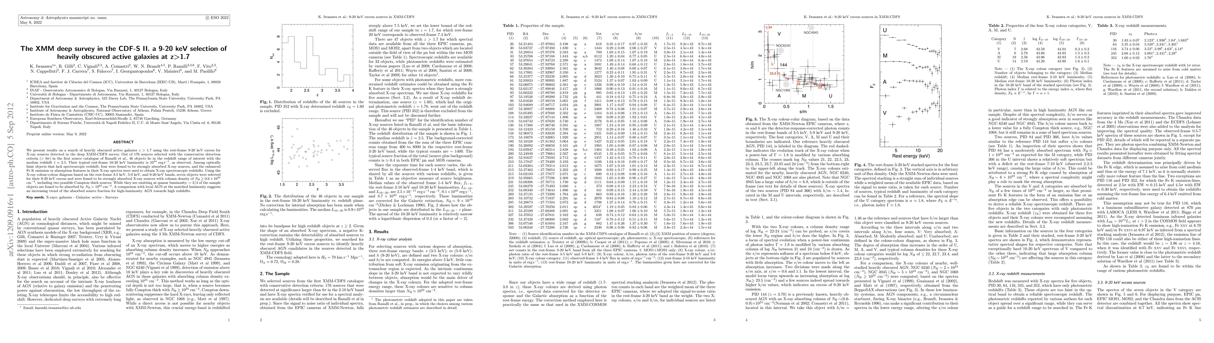 We present results on a search of heavily obscured active galaxies z>1.7 using the rest-frame 9-20 keV excess for X-ray sources detected in the deep XMM-CDFS survey. Out of 176 sources selected with the conservative detection criteria (>8 sigma) in the first source catalogue of Ranalli et al., 46 objects lie in the redshift range of interest with the median redshift z~2.5. Their typical rest-frame 10-20 keV luminosity is 1e+44 erg/s, as observed. Among optically faint objects that lack spectroscopic redshift, four were found to be strongly absorbed X-ray sources, and the enhanced Fe K emission or absorption features in their X-ray spectra were used to obtain X-ray spectroscopic redshifts. Using the X-ray colour-colour diagram based on the rest-frame 3-5 keV, 5-9 keV, and 9-20 keV bands, seven objects were selected for their 9-20 keV excess and were found to be strongly absorbed X-ray sources with column density of nH > 0.6e+24 cm-2, including two possible Compton thick sources. While they are emitting at quasar luminosity, ~3/4 of the sample objects are found to be absorbed by nH > 1e+22 cm-2. A comparison with local AGN at the matched luminosity suggests an increasing trend of the absorbed source fraction for high-luminosity AGN towards high redshifts.