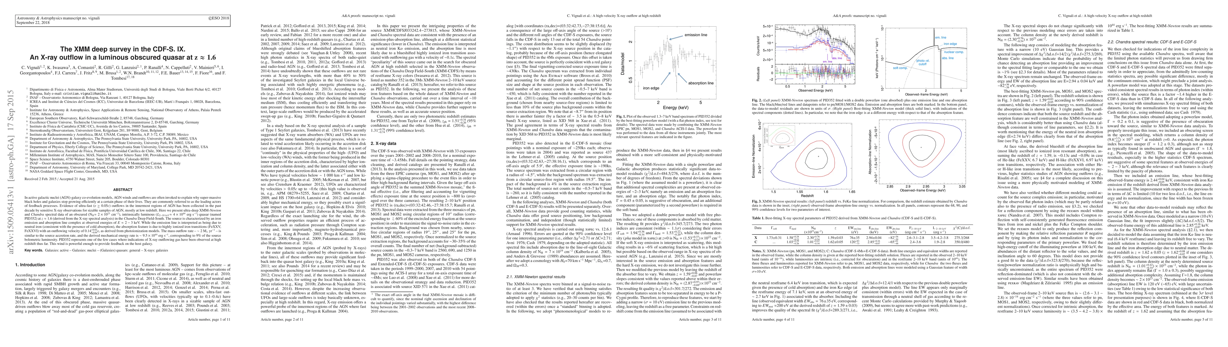In active galactic nuclei (AGN)-galaxy co-evolution models, AGN winds and outflows are often invoked to explain why super-massive black holes and galaxies stop growing efficiently at a certain phase of their lives. They are commonly referred to as the leading actors of feedback processes. Evidence of ultra-fast (v>0.05c) outflows in the innermost regions of AGN has been collected in the past decade by sensitive X-ray observations for sizable samples of AGN, mostly at low redshift. Here we present ultra-deep XMM-Newton and Chandra spectral data of an obscured (Nh~2x10^{23} cm^-2), intrinsically luminous (L2-10keV~4x10^{44} erg/s) quasar (named PID352) at z~1.6 (derived from the X-ray spectral analysis) in the Chandra Deep Field-South. The source is characterized by an iron emission and absorption line complex at observed energies of E~2-3 keV. While the emission line is interpreted as being due to neutral iron (consistent with the presence of cold absorption), the absorption feature is due to highly ionized iron transitions (FeXXV, FeXXVI) with an outflowing velocity of 0.14^{+0.02}_{-0.06}c, as derived from photoionization models. The mass outflow rate - ~2 Msun/yr - is similar to the source accretion rate, and the derived mechanical energy rate is ~9.5x10^{44} erg/s, corresponding to 9% of the source bolometric luminosity. PID352 represents one of the few cases where indications of X-ray outflowing gas have been observed at high redshift thus far. This wind is powerful enough to provide feedback on the host galaxy.