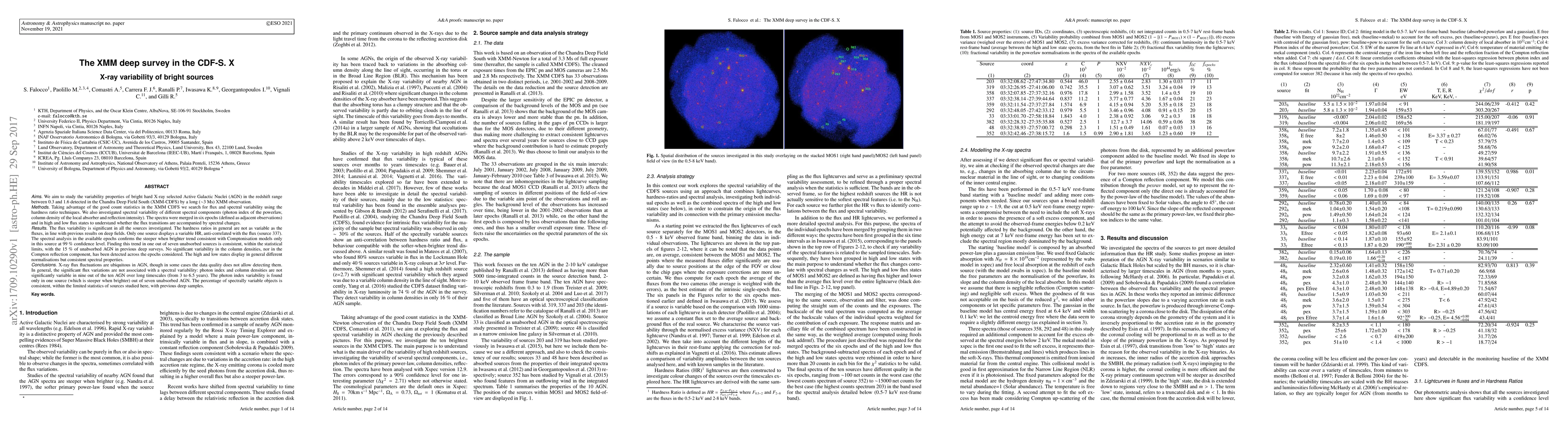 We aim to study the variability properties of bright hard X-ray selected Active Galactic Nuclei (AGN) with redshift between 0.3 and 1.6 detected in the Chandra Deep Field South (XMM-CDFS) by a long XMM observation. Taking advantage of the good count statistics in the XMM CDFS we search for flux and spectral variability using the hardness ratio techniques. We also investigated spectral variability of different spectral components. The spectra were merged in six epochs (defined as adjacent observations) and in high and low flux states to understand whether the flux transitions are accompanied by spectral changes. The flux variability is significant in all the sources investigated. The hardness ratios in general are not as variable as the fluxes. Only one source displays a variable HR, anti-correlated with the flux (source 337). The spectral analysis in the available epochs confirms the steeper when brighter trend consistent with Comptonisation models only in this source. Finding this trend in one out of seven unabsorbed sources is consistent, within the statistical limits, with the 15 % of unabsorbed AGN in previous deep surveys. No significant variability in the column densities, nor in the Compton reflection component, has been detected across the epochs considered. The high and low states display in general different normalisations but consistent spectral properties. X-ray flux fluctuations are ubiquitous in AGN. In general, the significant flux variations are not associated with a spectral variability: photon index and column densities are not significantly variable in nine out of the ten AGN over long timescales (from 3 to 6.5 years). The photon index variability is found only in one source (which is steeper when brighter) out of seven unabsorbed AGN. These results are consistent with previous deep samples.