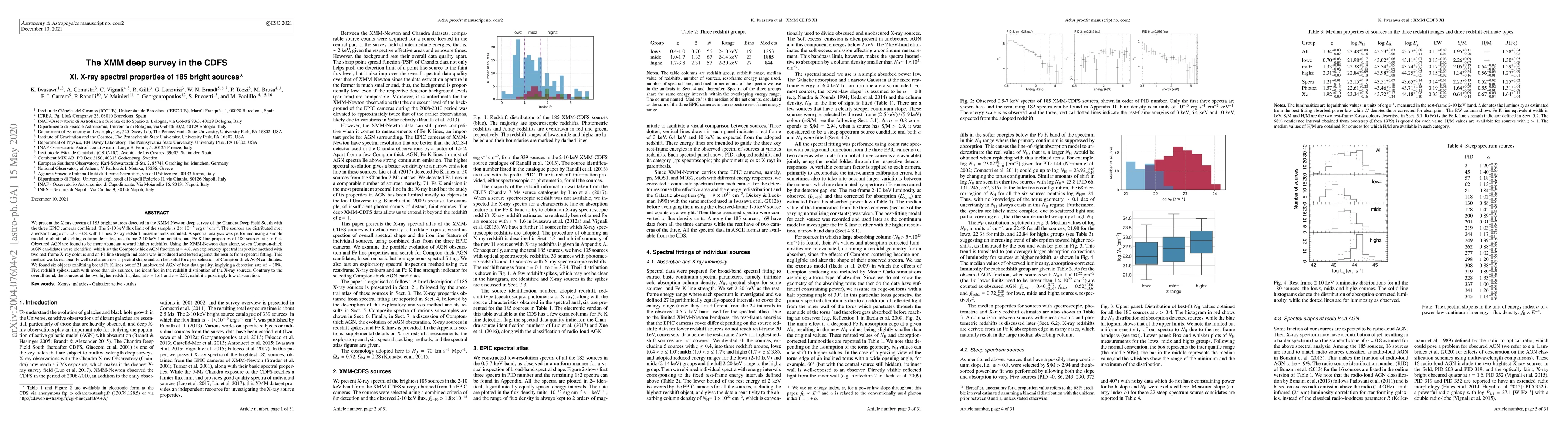 We present X-ray spectra of 185 bright sources detected in the XMM-Newton deep survey of the Chandra Deep Field South, combining the three EPIC cameras. The 2-10 keV flux limit of the sample is 2e-15 erg/s/cm2. The sources are distributed over a redshift range of z=0.1-3.8. Eleven new X-ray redshift measurements are included. A spectral analysis was performed using a simple model to obtain absorbing column densities, rest-frame 2-10 keV luminosities and Fe K line properties of 180 sources at z>0.4. Obscured AGN are found to be more abundant toward higher redshifts. Using the XMM-Newton data alone, seven Compton-thick AGN candidates are identified, which makes the Compton-thick AGN fraction to be ~4%. An exploratory spectral inspection method with two rest-frame X-ray colours and an Fe line strength indicator is introduced and tested against the results from spectral fitting. This method works reasonably well to characterise a spectral shape and can be useful for a pre-selection of Compton-thick AGN candidates. We found six objects exhibiting broad Fe K lines out of 21 unobscured AGN of best data quality, implying a detection rate of ~30%. Five redshift spikes, each of which has more than six sources, are identified in the redshift distribution of the X-ray sources. Contrary to the overall trend, the sources at the two higher-redshift spikes at z=1.61 and z=2.57 have puzzlingly low obscuration.
