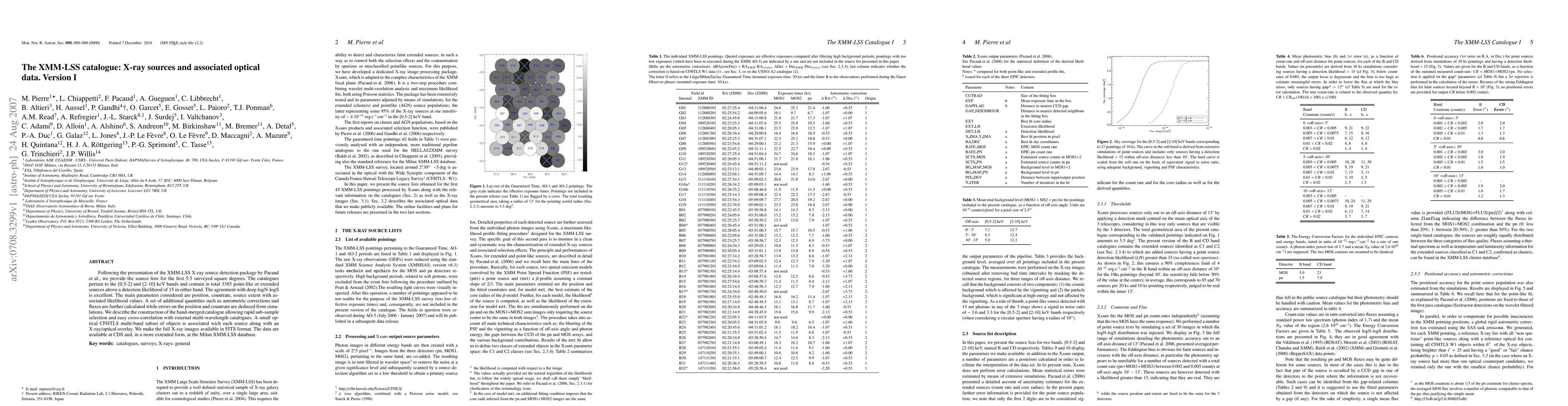 The XMM-LSS catalogue presents X-ray source detections from 5.5 square degrees, detailing 3385 sources in [0.5-2] and [2-10] keV bands. It includes positional, countrate, and extent data, with cross-correlations to optical CFHTLS data and full X-ray images in FITS format.