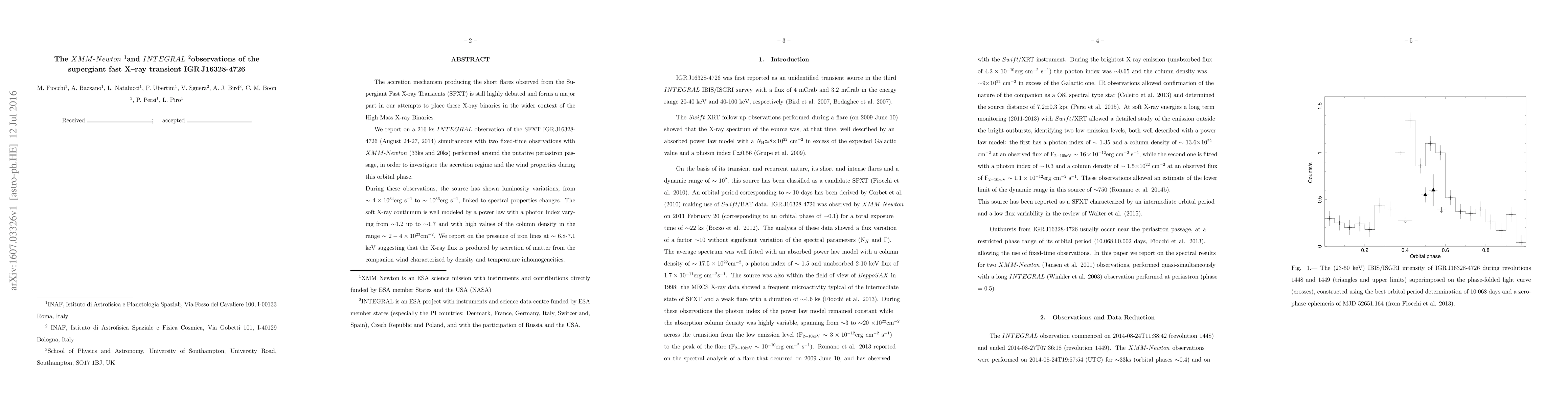 The accretion mechanism producing the short flares observed from the Supergiant Fast X-ray Transients (SFXT) is still highly debated and forms a major part in our attempts to place these X-ray binaries in the wider context of the High Mass X-ray Binaries. We report on a 216 ks INTEGRAL observation of the SFXT IGR J16328-4726 (August 24-27, 2014) simultaneous with two fixed-time observations with XMM Newton (33ks and 20ks) performed around the putative periastron passage, in order to investigate the accretion regime and the wind properties during this orbital phase. During these observations, the source has shown luminosity variations, from 4x10^{34} erg/s to 10^{36} erg/s, linked to spectral properties changes. The soft X-ray continuum is well modeled by a power law with a photon index varying from 1.2 up to 1.7 and with high values of the column density in the range 2-4x10^{23}/cm^2. We report on the presence of iron lines at 6.8-7.1 keV suggesting that the X-ray flux is produced by accretion of matter from the companion wind characterized by density and temperature inhomogeneities.