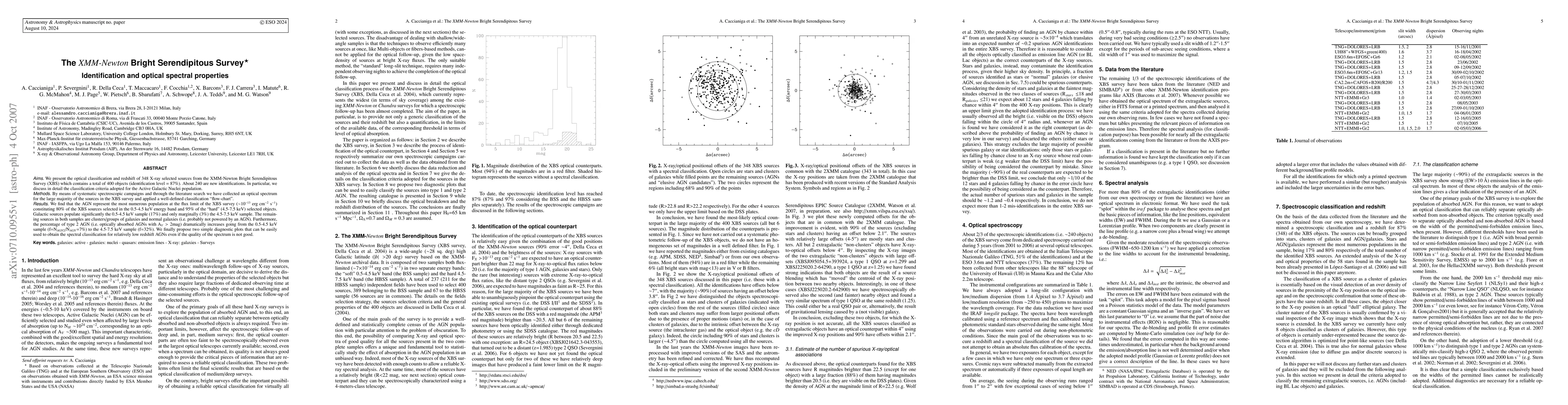 This paper presents the optical classification and redshift of 348 X-ray sources from the XMM-Newton Bright Serendipitous Survey, identifying 80% as Active Galactic Nuclei (AGN), with 32% of these being type 2 AGNs in the higher energy band. The study proposes diagnostic plots for spectral classification of low redshift AGNs.