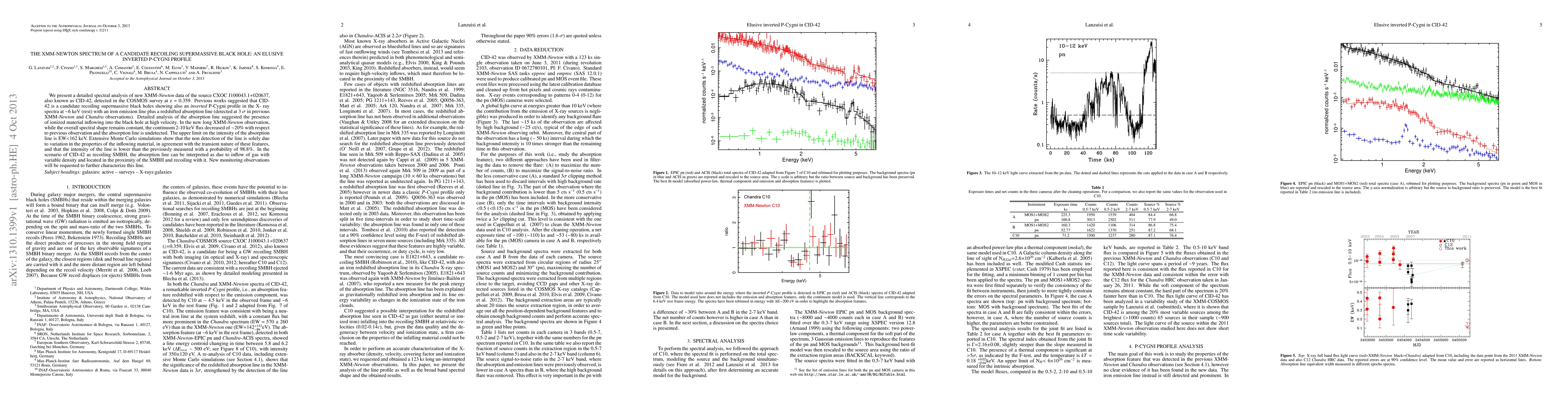 We present a detailed spectral analysis of new XMM-Newton data of the source CXOC J100043.1+020637, also known as CID-42, detected in the COSMOS survey at z = 0.359. Previous works suggested that CID-42 is a candidate recoiling supermassive black holes showing also an inverted P-Cygni profile in the X- ray spectra at ~6 keV (rest) with an iron emission line plus a redshifted absorption line (detected at 3sigma in previous XMM-Newton and Chandra observations). Detailed analysis of the absorption line suggested the presence of ionized material inflowing into the black hole at high velocity. In the new long XMM-Newton observation, while the overall spectral shape remains constant, the continuum 2-10 keV flux decreased of ~20% with respect to previous observation and the absorption line is undetected. The upper limit on the intensity of the absorption line is EW<162 keV. Extensive Monte Carlo simulations show that the non detection of the line is solely due to variation in the properties of the inflowing material, in agreement with the transient nature of these features, and that the intensity of the line is lower than the previously measured with a probability of 98.8%. In the scenario of CID-42 as recoiling SMBH, the absorption line can be interpreted as due to inflow of gas with variable density and located in the proximity of the SMBH and recoiling with it. New monitoring observations will be requested to further characterize this line.