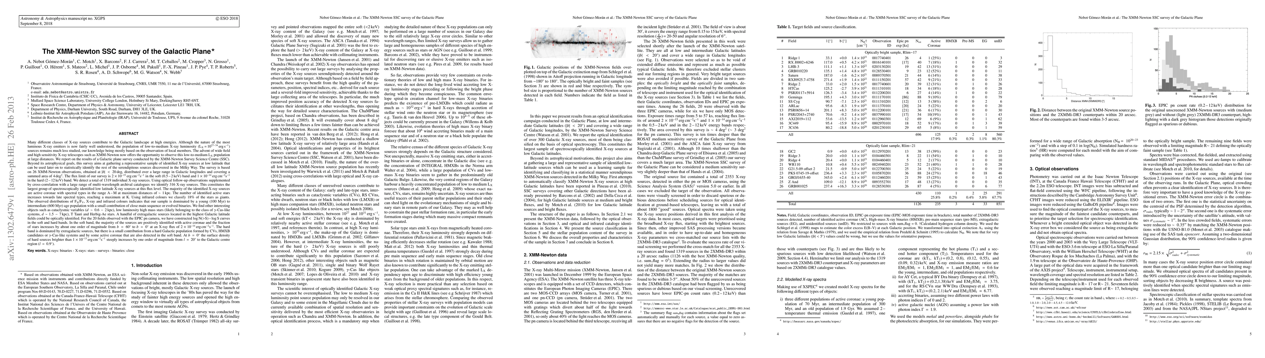Many different classes of X-ray sources contribute to the Galactic landscape at high energies. Although the nature of the most luminous X-ray emitters is now fairly well understood, the population of low-to-medium X-ray luminosity (Lx = 10^27-10^34 erg/s) sources remains much less studied, our knowledge being mostly based on the observation of local members. The advent of wide field and high sensitivity X-ray telescopes such as XMM-Newton now offers the opportunity to observe this low-to-medium Lx population at large distances. We report on the results of a Galactic plane survey conducted by the XMM-Newton Survey Science Centre (SSC). Beyond its astrophysical goals, this survey aims at gathering a representative sample of identified X-ray sources at low latitude that can be used later on to statistically identify the rest of the serendipitous sources discovered in the Milky Way. The survey is based on 26 XMM-Newton observations, obtained at |b| < 20 deg, distributed over a large range in Galactic longitudes and covering a summed area of 4 deg2. The flux limit of our survey is 2 x 10-15 erg/cm^2/s in the soft (0.5 - 2 keV) band and 1 x 10^-14 erg/cm^2/s in the hard (2 - 12 keV) band. We detect a total of 1319 individual X-ray sources. Using optical follow-up observations supplemented by cross-correlation with a large range of multi-wavelength archival catalogues we identify 316 X-ray sources. This constitutes the largest group of spectroscopically identified low latitude X-ray sources at this flux level. The majority of the identified X-ray sources are active coronae with spectral types in the range A - M at maximum distances of ~ 1 kpc. The number of identified active stars increases towards late spectral types, reaching a maximum at K. (abridged)