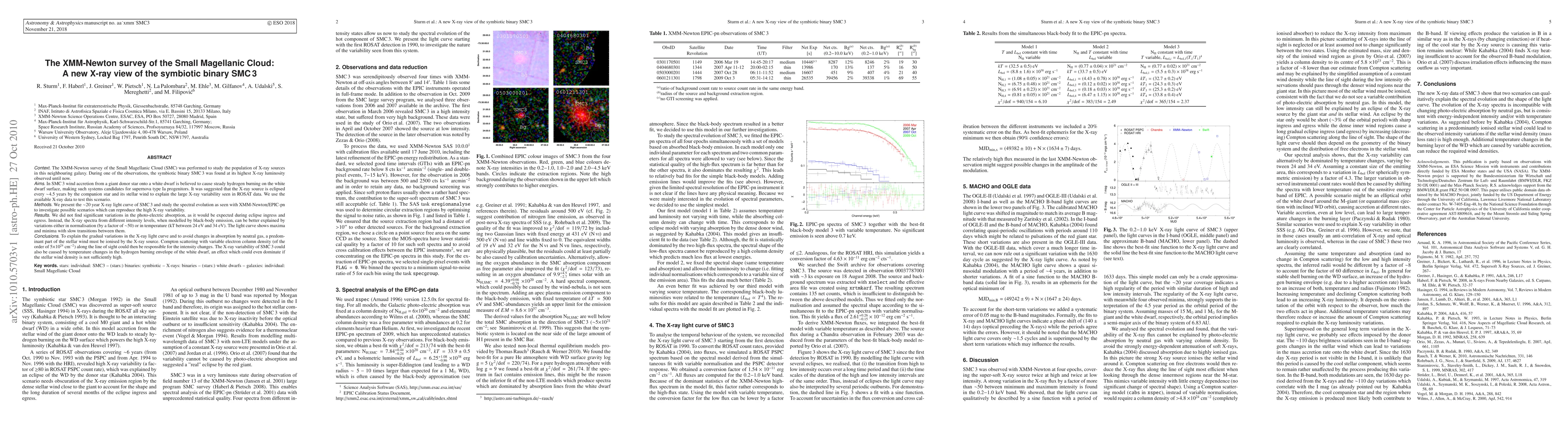 The XMM-Newton survey of the Small Magellanic Cloud (SMC) was performed to study the population of X-ray sources in this neighbouring galaxy. During one of the observations, the symbiotic binary SMC3 was found at its highest X-ray luminosity observed until now. In SMC3 wind accretion from a giant donor star onto a white dwarf is believed to cause steady hydrogen burning on the white dwarf surface, making such systems candidates for supernova type Ia progenitors. It was suggested that the X-ray source is eclipsed every ~4.5 years by the companion star and its stellar wind to explain the large X-ray variability seen in ROSAT data. We use the available X-ray data to test this scenario. We present the ~20 year X-ray light curve of SMC3 and study the spectral evolution as seen with XMM-Newton/EPIC-pn to investigate possible scenarios which can reproduce the high X-ray variability. We did not find significant variations in the photo-electric absorption, as it would be expected during eclipse ingress and egress. Instead, the X-ray spectra from different intensity levels, when modelled by black-body emission, can be better explained by variations either in normalisation (by a factor of ~50) or in temperature (kT between 24 eV and 34 eV). The light curve shows maxima and minima with slow transitions between them. To explain the gradual variations in the X-ray light curve and to avoid changes in absorption by neutral gas, a predominant part of the stellar wind must be ionised by the X-ray source. Compton scattering with variable electron column density (of the order of 5 x 10^24 cm^-2) along the line of sight could then be responsible for the intensity changes. The X-ray variability of SMC3 could also be caused by temperature changes in the hydrogen burning envelope of the white dwarf, an effect which could even dominate if the stellar wind density is not sufficiently high.