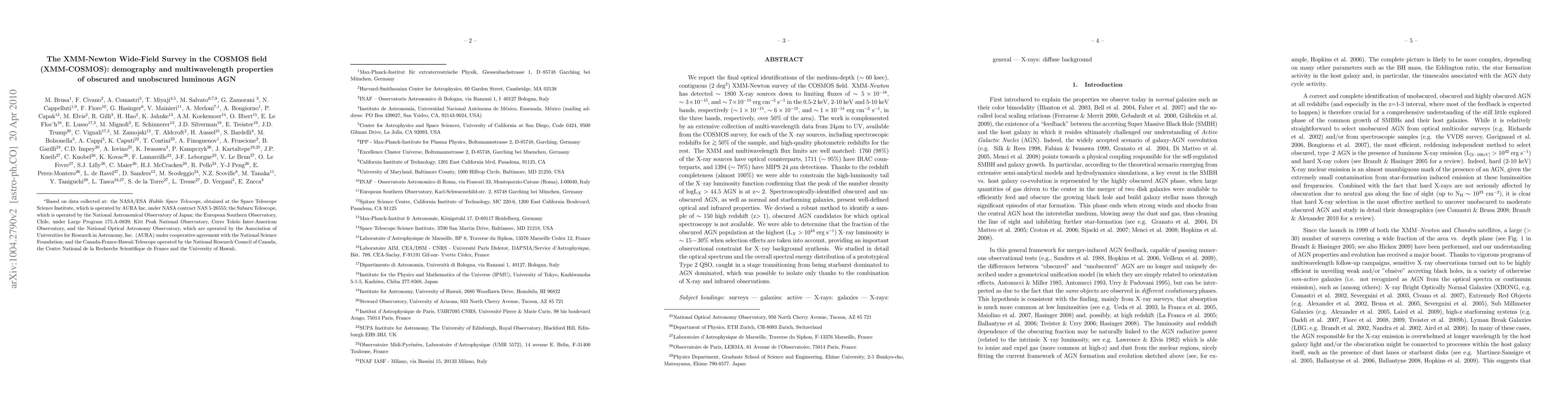 The XMM-Newton Wide-Field Survey in the COSMOS field identifies ~800 X-ray sources, revealing detailed multiwavelength properties of both obscured and unobscured luminous AGN, with a significant fraction (~15-30%) of high-luminosity obscured AGN at z>1. The study provides crucial observational constraints for X-ray background synthesis and highlights the transition from starburst to AGN dominance in a prototypical Type 2 QSO.