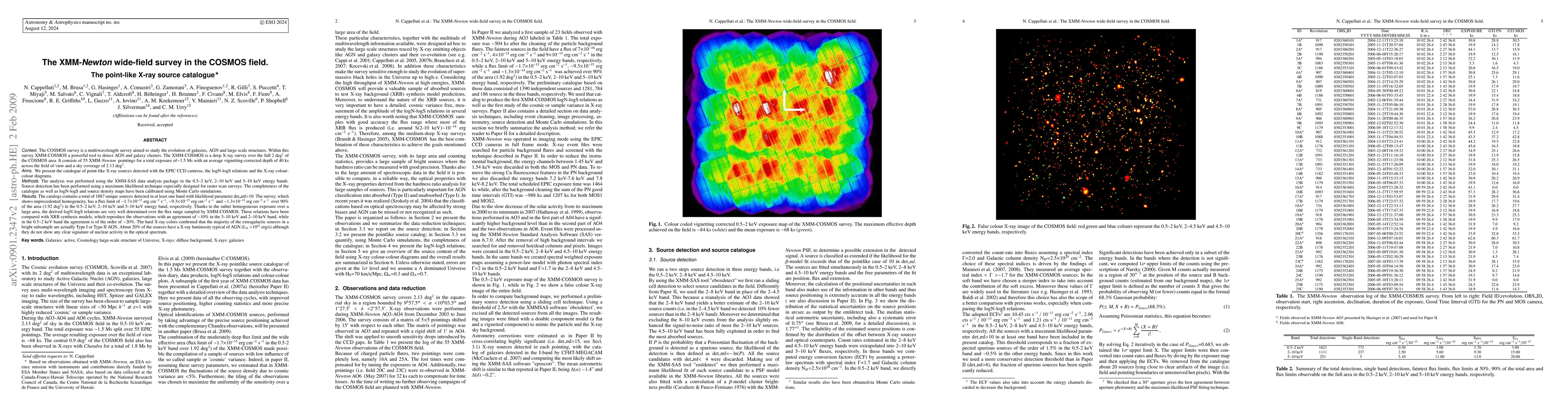 The COSMOS survey is a multiwavelength survey aimed to study the evolution of galaxies, AGN and the large scale structure. The XMM-COSMOS is a deep X-ray survey over the full 2 deg2 of the COSMOS area. It consists of 55 XMM-Newton pointings for a total exposure of ~1.5 Ms with an average vignetting corrected depth of 40 ks across the field of view and a sky coverage of 2.13 deg2. We present the catalogue of point-like X-ray sources detected with the EPIC CCD cameras, the logN-logS relations and the X-ray colour-colour diagrams. The analysis was performed in the 0.5-2 keV, 2-10 keV and 5-10 keV energy bands. The completeness of the catalogue as well as logN-logS have been calibrated using Monte Carlo simulations. The catalogs contains a total of 1887 unique sources detected in at least one band. The survey, that shows unprecedented homogeneity, has a flux limit of ~1.7x10-15 erg cm-2 s-1, ~9.3x10-15 erg cm-2 s-1 and ~1.3x10-14 erg cm-2 s-1 over 90% of the area (1.92 deg2) in the 0.5-2 keV, 2-10 keV and 5-10 keV energy band, respectively. Thanks to the rather homogeneous exposure over a large area, the derived logN-logS relations are very well determined over the flux range sampled by XMM-COSMOS. These relations have been compared with XRB synthesis models, which reproduce the observations with an agreement of ~10% in the 5-10 keV and 2-10 keV band, while in the 0.5-2 keV band the agreement is of the order of ~20%. The hard X-ray colors confirmed that the majority of the extragalactic sources, in a bright subsample, are actually Type I or Type II AGN. About 20% of the sources have X-ray luminosity typical of AGN (L_X >1042 erg/s) although they do not show any clear signature of nuclear activity in the optical spectrum.
