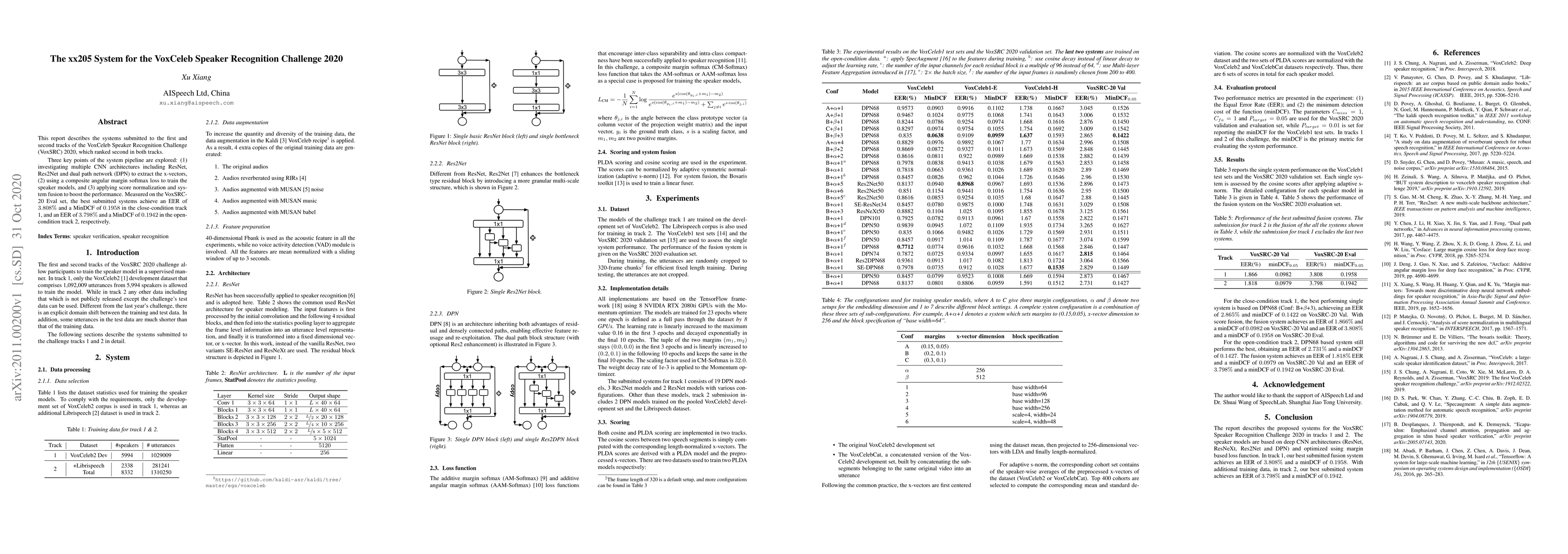 This report describes the systems submitted to the first and second tracks of the VoxCeleb Speaker Recognition Challenge (VoxSRC) 2020, which ranked second in both tracks. Three key points of the system pipeline are explored: (1) investigating multiple CNN architectures including ResNet, Res2Net and dual path network (DPN) to extract the x-vectors, (2) using a composite angular margin softmax loss to train the speaker models, and (3) applying score normalization and system fusion to boost the performance. Measured on the VoxSRC-20 Eval set, the best submitted systems achieve an EER of $3.808\%$ and a MinDCF of $0.1958$ in the close-condition track 1, and an EER of $3.798\%$ and a MinDCF of $0.1942$ in the open-condition track 2, respectively.