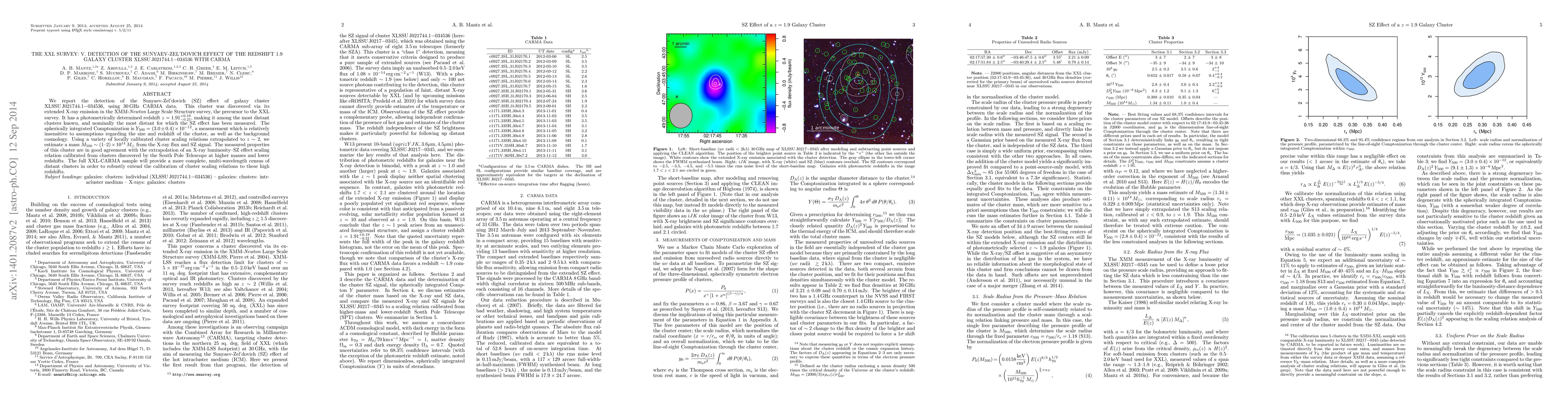The XXL Survey detected the Sunyaev-Zel'dovich effect of the distant galaxy cluster XLSSU J021744.1-034536 at redshift $z=1.91$, using CARMA data. This cluster, discovered via XMM-Newton, has a mass estimate of $(1$-$2)\times 10^{14}M_{sun}$ and exhibits properties consistent with lower-redshift clusters.