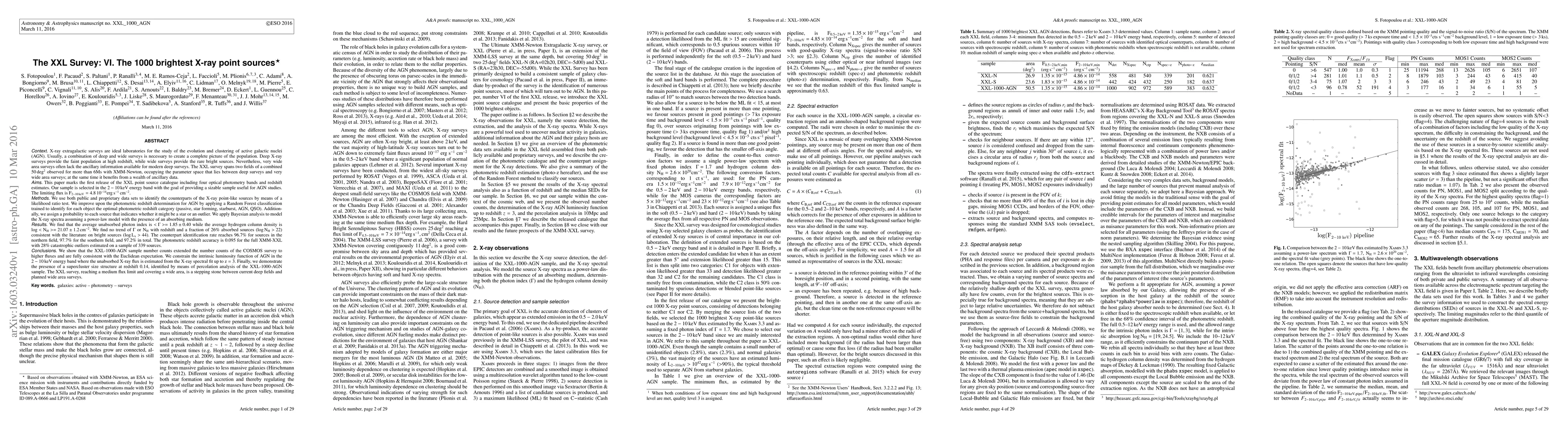 The XXL Survey presents the first release of its catalogue of the 1000 brightest X-ray point sources, identified using data from XMM-Newton and ancillary datasets. The study reveals an average unabsorbed photon index and hydrogen column density, finds no trend in these parameters with redshift, and identifies a supercluster structure at redshift 0.14, demonstrating the survey's value in bridging deep and wide area extragalactic studies.