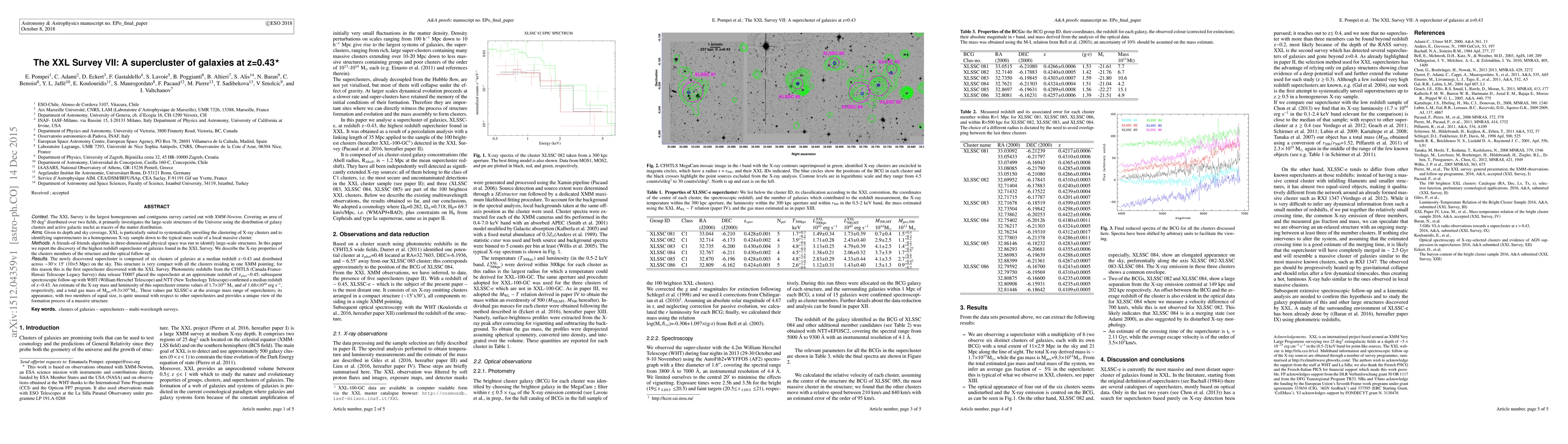 The XXL Survey is the largest homogeneous and contiguous survey carried out with XMM-Newton. Covering an area of 50 square degrees distributed over two fields, it primarily investigates the large-scale structures of the Universe using the distribution of galaxy clusters and active galactic nuclei as tracers of the matter distribution. Given its depth and sky coverage, XXL is particularly suited to systematically unveiling the clustering of X-ray clusters and to identifying superstructures in a homogeneous X-ray sample down to the typical mass scale of a local massive cluster. A friends-of-friends algorithm in three-dimensional physical space was run to identify large-scale structures. In this paper we report the discovery of the highest redshift supercluster of galaxies found in the XXL Survey. We describe the X-ray properties of the clusters members of the structure and the optical follow-up. The newly discovered supercluster is composed of six clusters of galaxies at a median redshift z around 0.43 and distributed across approximately 30 by 15 arc minutes (10 by 5 Mpc on sky) on the sky. This structure is very compact with all the clusters residing in one XMM pointing; for this reason this is the first supercluster discovered with the XXL Survey. Spectroscopic follow-up with WHT (William Herschel Telescope) and NTT (New Technology Telescope) confirmed a median redshift of z = 0.43. An estimate of the X-ray mass and luminosity of this supercluster and of its total gas mass put XLSSC-e at the average mass range of superclusters; its appearance, with two members of equal size, is quite unusual with respect to other superclusters and provides a unique view of the formation process of a massive structure.