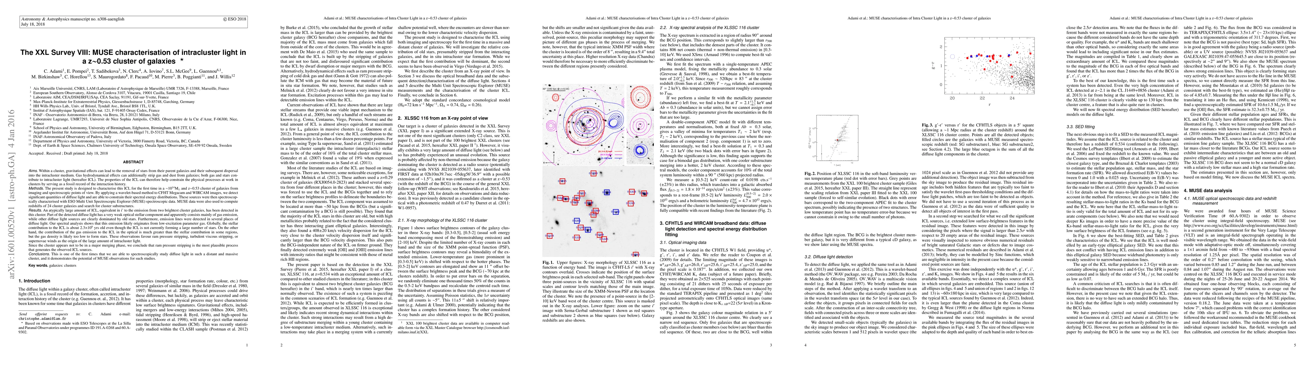 Within a cluster, gravitational effects can lead to the removal of stars from their parent galaxies. Gas hydrodynamical effects can additionally strip gas and dust from galaxies. The properties of the ICL can therefore help constrain the physical processes at work in clusters by serving as a fossil record of the interaction history. The present study is designed to characterise this ICL in a ~10^14 M_odot and z~0.53 cluster of galaxies from imaging and spectroscopic points of view. By applying a wavelet-based method to CFHT Megacam and WIRCAM images, we detect significant quantities of diffuse light. These sources were then spectroscopically characterised with MUSE. MUSE data were also used to compute redshifts of 24 cluster galaxies and search for cluster substructures. An atypically large amount of ICL has been detected in this cluster. Part of the detected diffuse light has a very weak optical stellar component and apparently consists mainly of gas emission, while other diffuse light sources are clearly dominated by old stars. Furthermore, emission lines were detected in several places of diffuse light. Our spectral analysis shows that this emission likely originates from low-excitation parameter gas. The stellar contribution to the ICL is about 2.3x10^9 yrs old even though the ICL is not currently forming a large number of stars. On the other hand, the contribution of the gas emission to the ICL in the optical is much greater than the stellar contribution in some regions, but the gas density is likely too low to form stars. These observations favour ram pressure stripping, turbulent viscous stripping, or supernovae winds as the origin of the large amount of intracluster light. Since the cluster appears not to be in a major merging phase, we conclude that ram pressure stripping is the most plausible process that generates the observed ICL sources.
