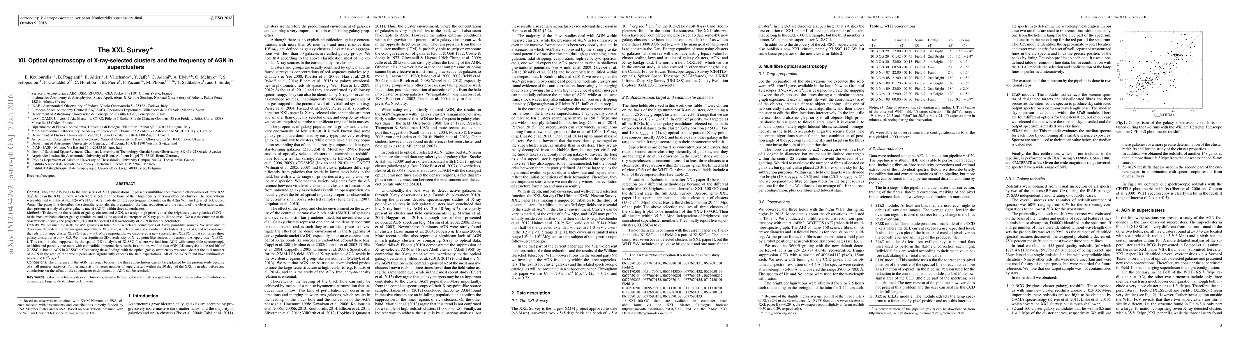 This article belongs to the first series of XXL publications. It presents multifibre spectroscopic observations of three 0.55 sq.deg. fields in the XXL Survey, which were selected on the basis of their high density of X-ray-detected clusters. The observations were obtained with the AutoFib2+WYFFOS (AF2) wide-field fibre spectrograph mounted on the 4.2m William Herschel Telescope. The paper first describes the scientific rationale, the preparation, the data reduction, and the results of the observations, and then presents a study of active galactic nuclei (AGN) within three superclusters. We obtained redshifts for 455 galaxies in total, 56 of which are counterparts of X-ray point-like sources. We were able to determine the redshift of the merging supercluster XLSSC-e, which consists of six individual clusters at z~0.43, and we confirmed the redshift of supercluster XLSSC-d at z~0.3. More importantly, we discovered a new supercluster, XLSSC-f, that comprises three galaxy clusters also at z~0.3. We find a significant 2D overdensity of X-ray point-like sources only around the supercluster XLSSC-f. This result is also supported by the spatial (3D) analysis of XLSSC-f, where we find four AGN with compatible spectroscopic redshifts and possibly one more with compatible photometric redshift. In addition, we find two AGN (3D analysis) at the redshift of XLSSC-e, but no AGN in XLSSC-d. Comparing these findings with the optical galaxy overdensity we conclude that the total number of AGN in the area of the three superclusters significantly exceeds the field expectations. The difference in the AGN frequency between the three superclusters cannot be explained by the present study because of small number statistics. Further analysis of a larger number of superclusters within the 50 sq. deg. of the XXL is needed before any conclusions on the effect of the supercluster environment on AGN can be reached.