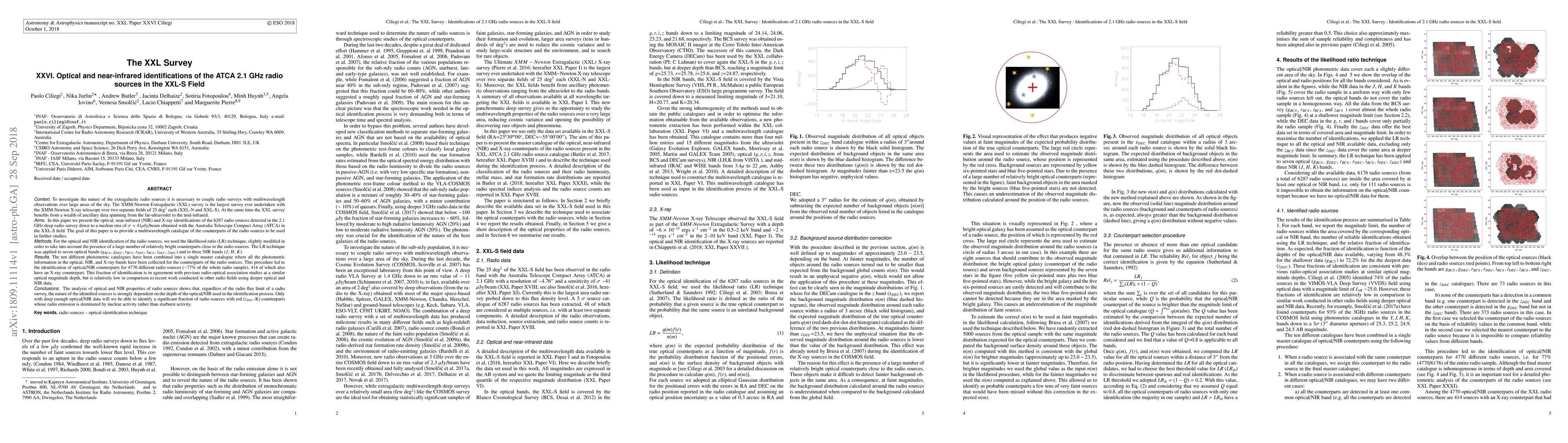 This study presents a multi-wavelength catalog of counterparts for 4770 out of 6287 radio sources detected in the XXL-S field using the ATCA at 2.1 GHz. The identification was done via a modified likelihood ratio technique, revealing 414 radio sources with X-ray counterparts. The findings suggest that optical/NIR identification depth significantly impacts the nature of identified radio sources, with deeper data crucial for identifying nuclear activity-dominated sources.