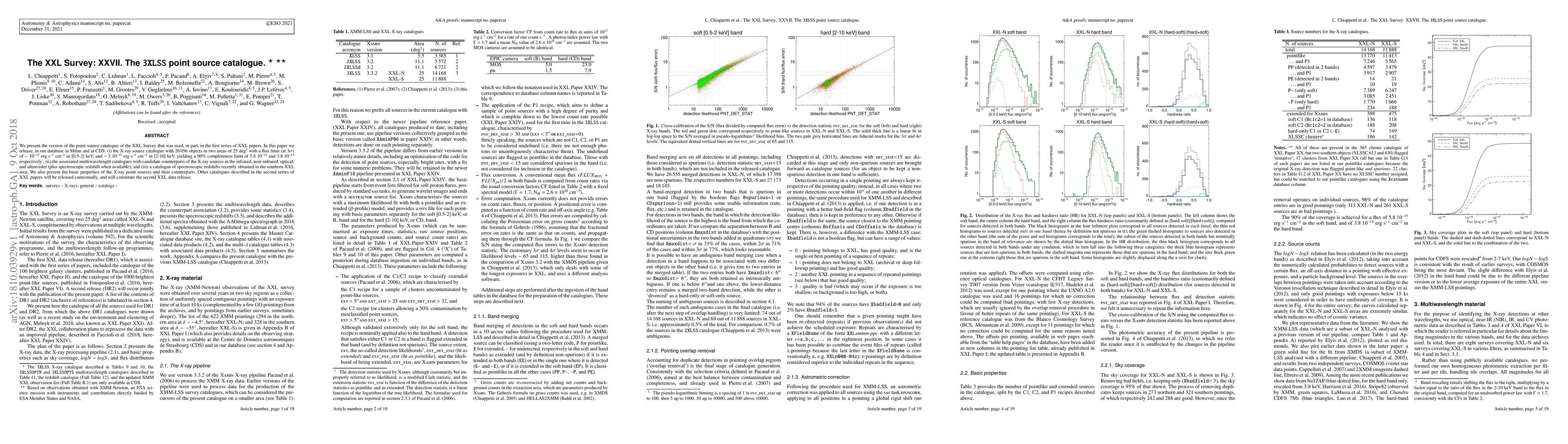 The XXL Survey presents a comprehensive X-ray point source catalogue with 26,056 objects across two 25 deg² areas, along with associated multiwavelength counterparts and spectroscopic redshifts, forming part of the first XXL data release. Further catalogues will be released in the second series.