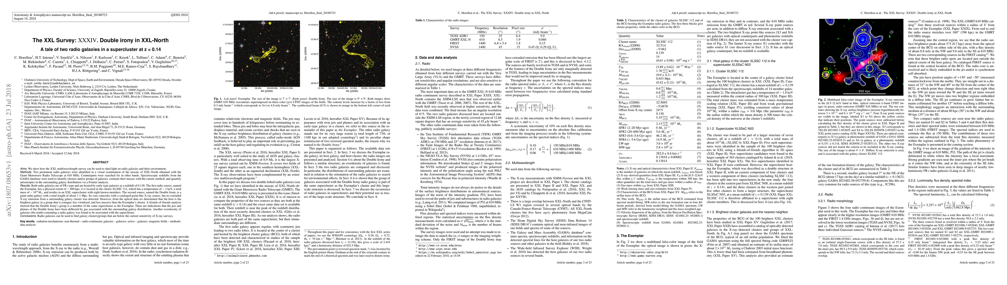 We show how the XXL multiwavelength survey can be used to shed light on radio galaxies and their environment. Two prominent radio galaxies were identified in a visual examination of the mosaic of XXL-North obtained with the Giant Metrewave Radio Telescope at 610MHz. Counterparts were searched for in other bands. Spectroscopic redshifts from the GAMA database were used to identify clusters and/or groups of galaxies, estimate their masses with the caustic method, and quantify anisotropies in the surrounding galaxy distribution via a Fourier analysis. Both radio galaxies are of FR I type and are hosted by early-type galaxies at a redshift of 0.138. The first radio source, named the Exemplar, has a physical extent of about 400 kpc; it is located in the cluster XLSSC112, which has a temperature of about 2 keV, a total mass of about $10^{14} M_\odot$, and resides in an XXL supercluster with eight known members. The second source, named the Double Irony, is a giant radio galaxy with a total length of about 1.1 Mpc. Its core coincides with a cataloged point-like X-ray source, but no extended X-ray emission from a surrounding galaxy cluster was detected. However, from the optical data we determined that the host is the brightest galaxy in a group that is younger, less virialized, and less massive than the Exemplar's cluster. A friends-of-friends analysis showed that the Double Irony's group is a member of the same supercluster as the Exemplar. There are indications that the jets and plumes of the Double Irony have been deflected by gas associated with the surrounding galaxy distribution. Another overdensity of galaxies (the tenth) containing a radio galaxy was found to be associated with the supercluster. Radio galaxies can be used to find galaxy clusters/groups that are below the current sensitivity of X-ray surveys.