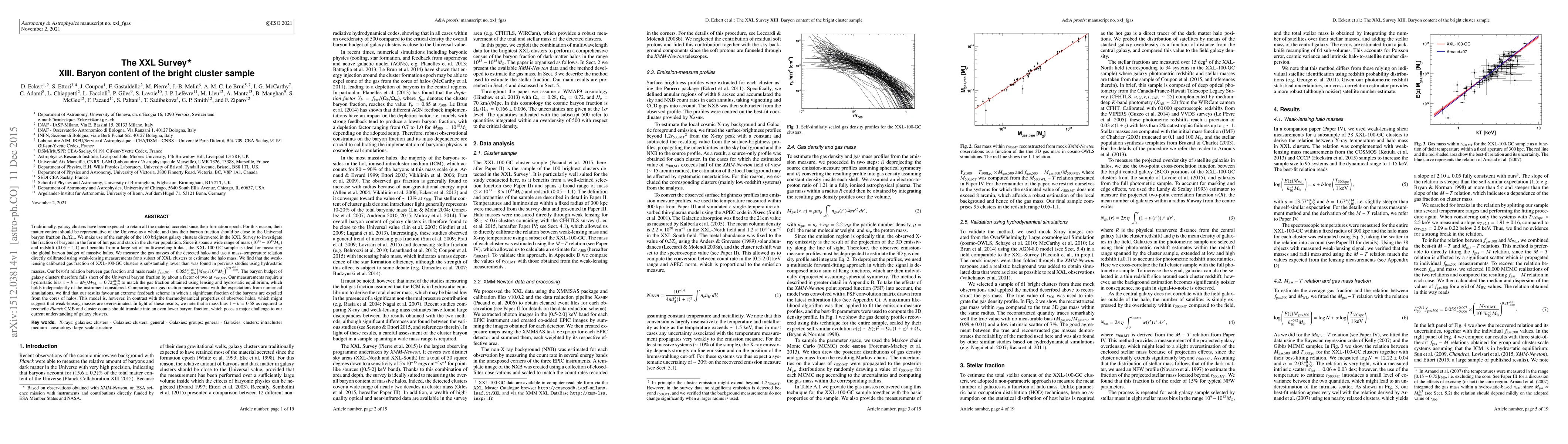 The XXL Survey investigates the baryon content of the 100 brightest galaxy clusters, finding that the gas fraction is significantly lower than previous studies, indicating clusters retain only about half of the expected universal baryon fraction. This discrepancy suggests extreme feedback mechanisms expel baryons, though it conflicts with observed thermodynamic properties.