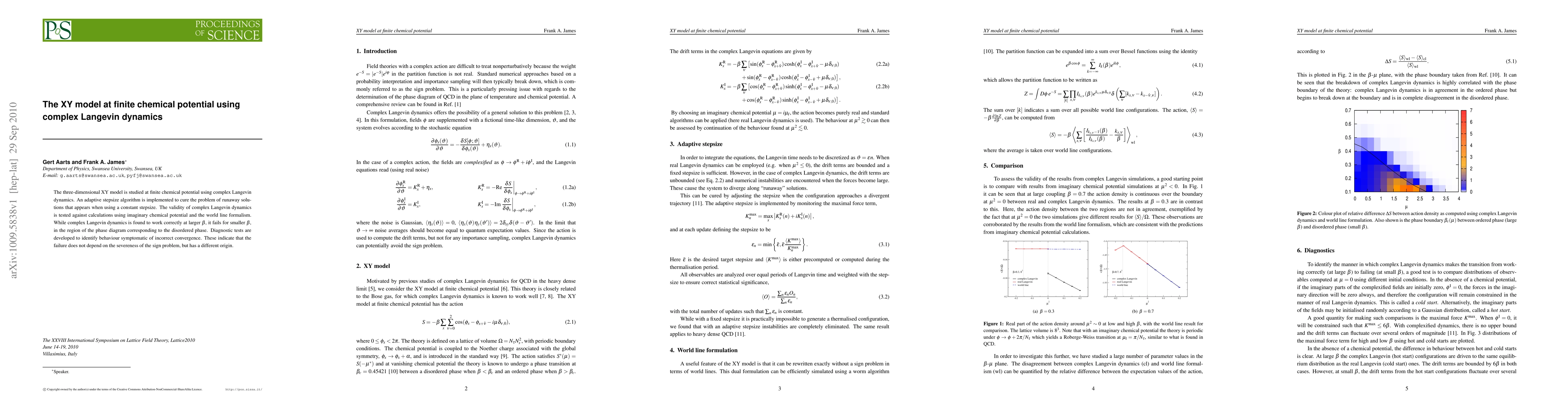 The three-dimensional XY model is studied at finite chemical potential using complex Langevin dynamics. An adaptive stepsize algorithm is implemented to cure the problem of runaway solutions that appears when using a constant stepsize. The validity of complex Langevin dynamics is tested against calculations using imaginary chemical potential and the world line formalism. While complex Langevin dynamics is found to work correctly at larger beta, it fails for smaller beta, in the region of the phase diagram corresponding to the disordered phase. Diagnostic tests are developed to identify behaviour symptomatic of incorrect convergence. These indicate that the failure does not depend on the severeness of the sign problem, but has a different origin.