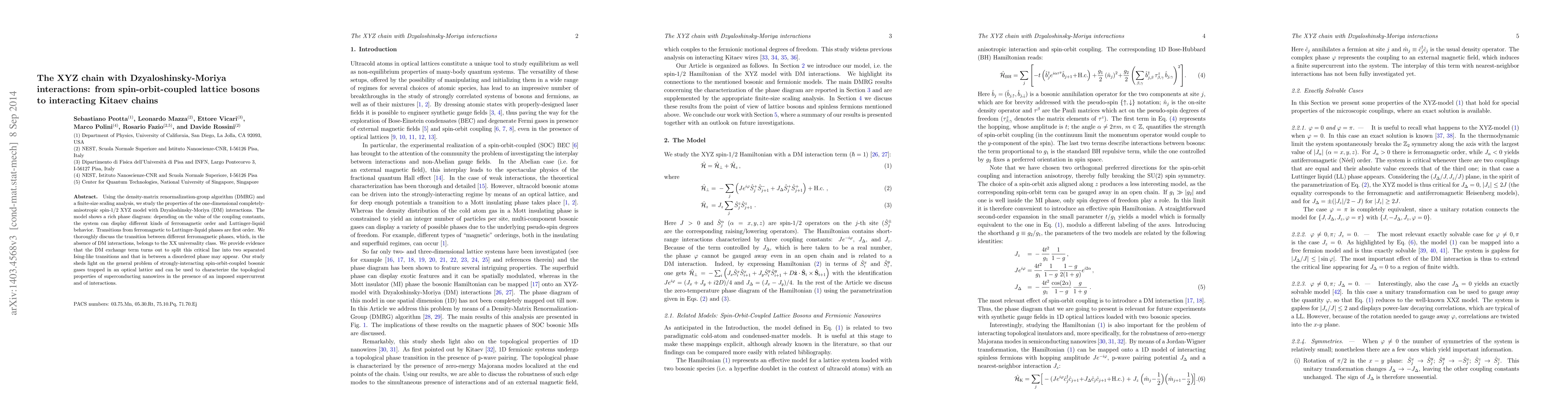 Using the density-matrix renormalization-group algorithm (DMRG) and a finite-size scaling analysis, we study the properties of the one-dimensional completely-anisotropic spin-1/2 XYZ model with Dzyaloshinsky-Moriya (DM) interactions. The model shows a rich phase diagram: depending on the value of the coupling constants, the system can display different kinds of ferromagnetic order and Luttinger-liquid behavior. Transitions from ferromagnetic to Luttinger-liquid phases are first order. We thoroughly discuss the transition between different ferromagnetic phases, which, in the absence of DM interactions, belongs to the XX universality class. We provide evidence that the DM exchange term turns out to split this critical line into two separated Ising-like transitions and that in between a disordered phase may appear. Our study sheds light on the general problem of strongly-interacting spin-orbit-coupled bosonic gases trapped in an optical lattice and can be used to characterize the topological properties of superconducting nanowires in the presence of an imposed supercurrent and of interactions.