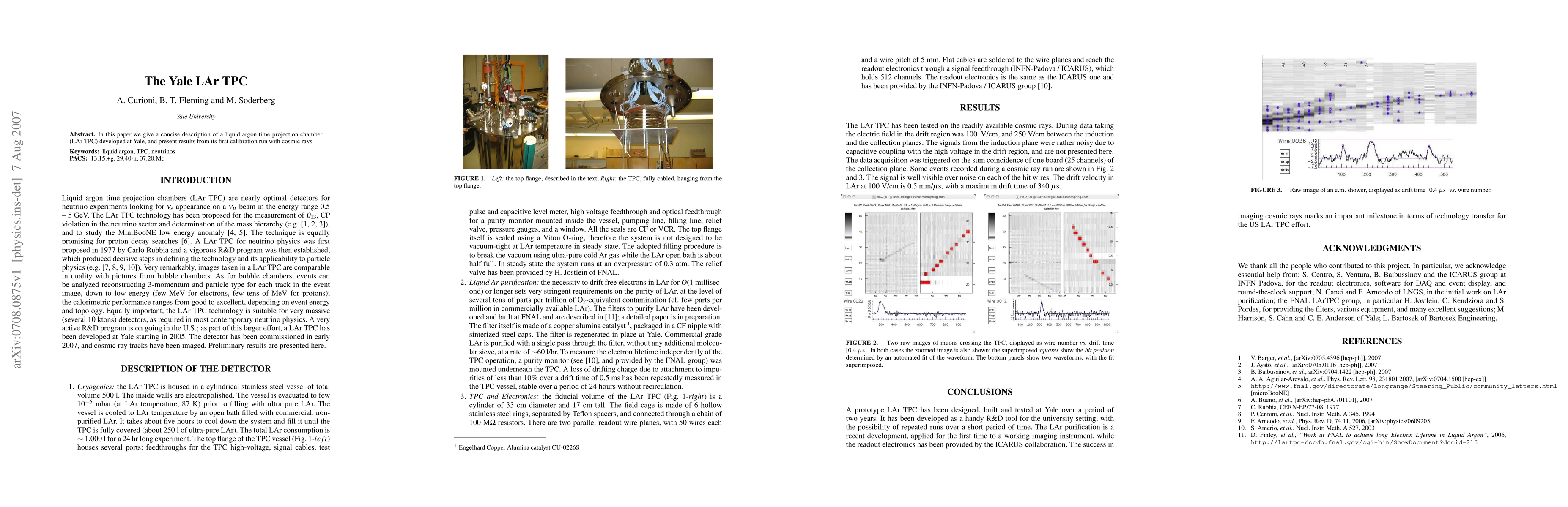 Summary: This paper introduces the Yale Lar TPC, a liquid argon time projection chamber developed at Yale, and reports initial calibration results from cosmic ray data collected during its first run.