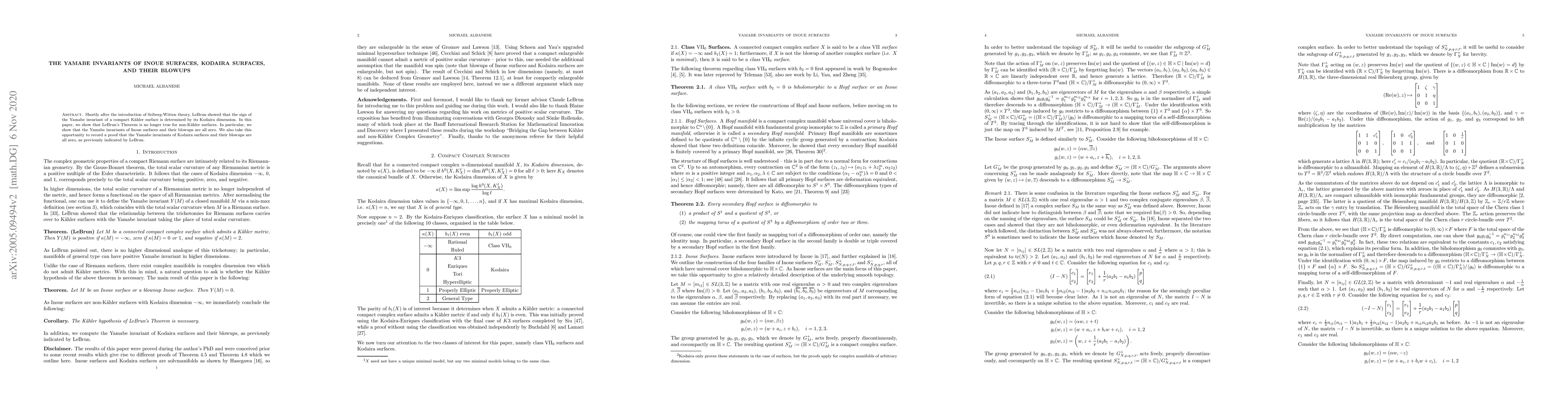 This paper demonstrates that LeBrun's Theorem regarding the Yamabe invariant's sign relation to the Kodaira dimension does not apply to non-Kähler surfaces. Specifically, it shows that the Yamabe invariants of Inoue surfaces and their blowups are zero, and provides a proof that the same holds for Kodaira surfaces and their blowups.