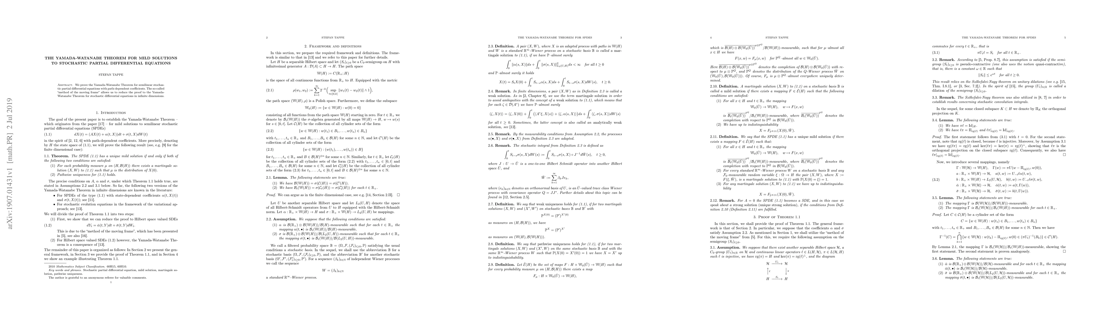 Summary: This paper proves the Yamada-Watanabe Theorem for semilinear stochastic partial differential equations with path-dependent coefficients using the method of the moving frame, which simplifies the proof by reducing it to the infinite-dimensional case of stochastic differential equations.