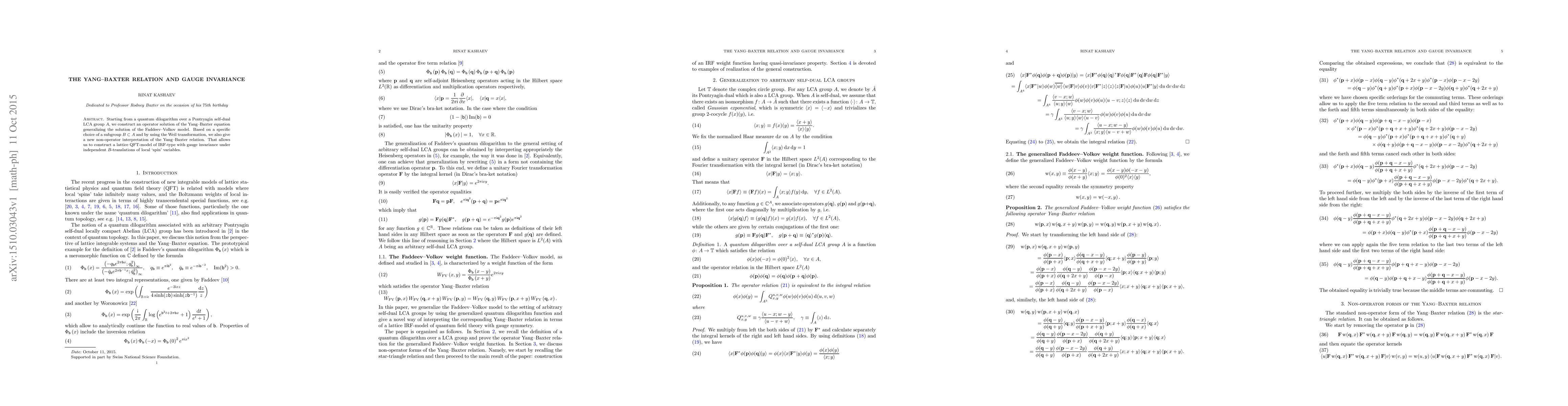 The paper constructs an operator solution to the Yang-Baxter equation from a quantum dilogarithm over a Pontryagin self-dual group, extending the Faddeev-Volkov model, and provides a non-operator interpretation using the Weil transformation, leading to a gauge-invariant lattice QFT model with independent $B$-translations.