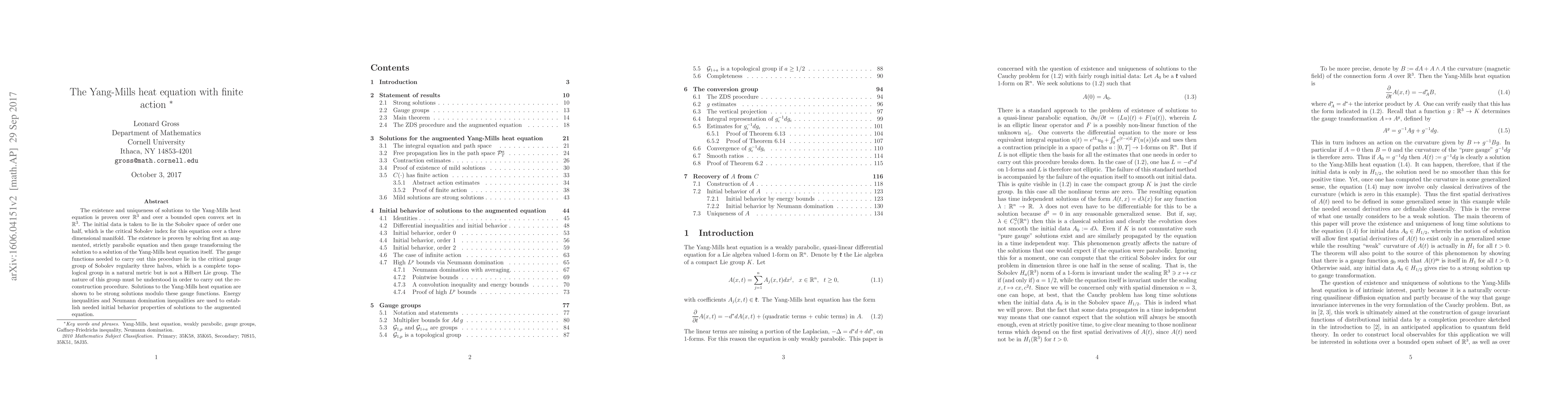 The existence and uniqueness of solutions to the Yang-Mills heat equation is proven over three dimensional Euclidean space and over a bounded open convex set therein. The initial data is taken to lie in the Sobolev space of order one half, which is the critical Sobolev index for this equation over a three dimensional manifold. The existence is proven by solving first an augmented, strictly parabolic equation and then gauge transforming the solution to a solution of the Yang-Mills heat equation itself. The gauge functions needed to carry out this procedure lie in the critical gauge group of Sobolev regularity three halves, which is a complete topological group in a natural metric but is not a Hilbert Lie group. The nature of this group must be understood in order to carry out the reconstruction procedure. Solutions to the Yang-Mills heat equation are shown to be strong solutions modulo these gauge functions. Energy inequalities and Neumann domination inequalities are used to establish needed initial behavior properties of solutions to the augmented equation.