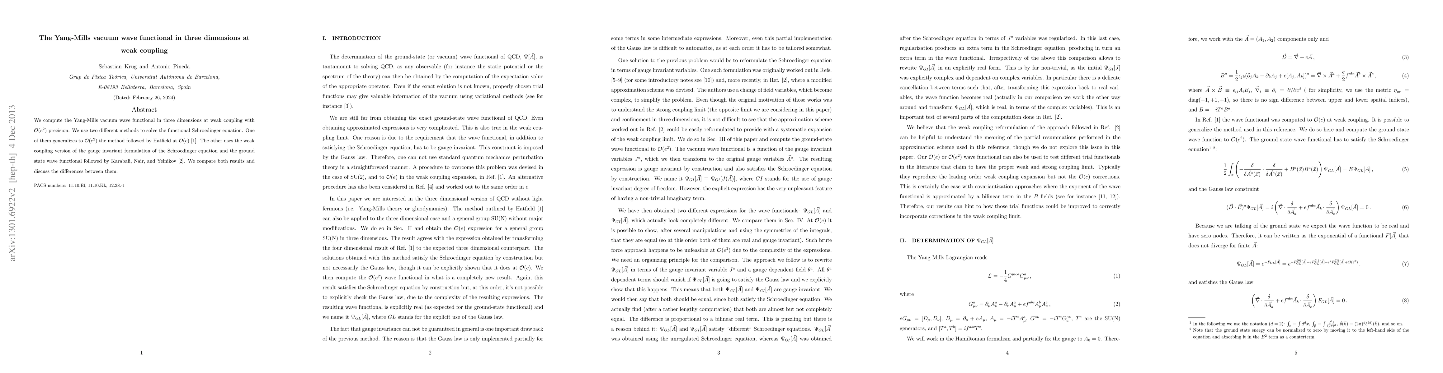 This paper computes the Yang-Mills vacuum wave functional in three dimensions at weak coupling to O(e^2) precision using two distinct methods. It compares results from both methods, generalizing Hatfield's O(e) approach and employing the weak coupling gauge invariant formulation by Karabali, Nair, and Yelnikov.