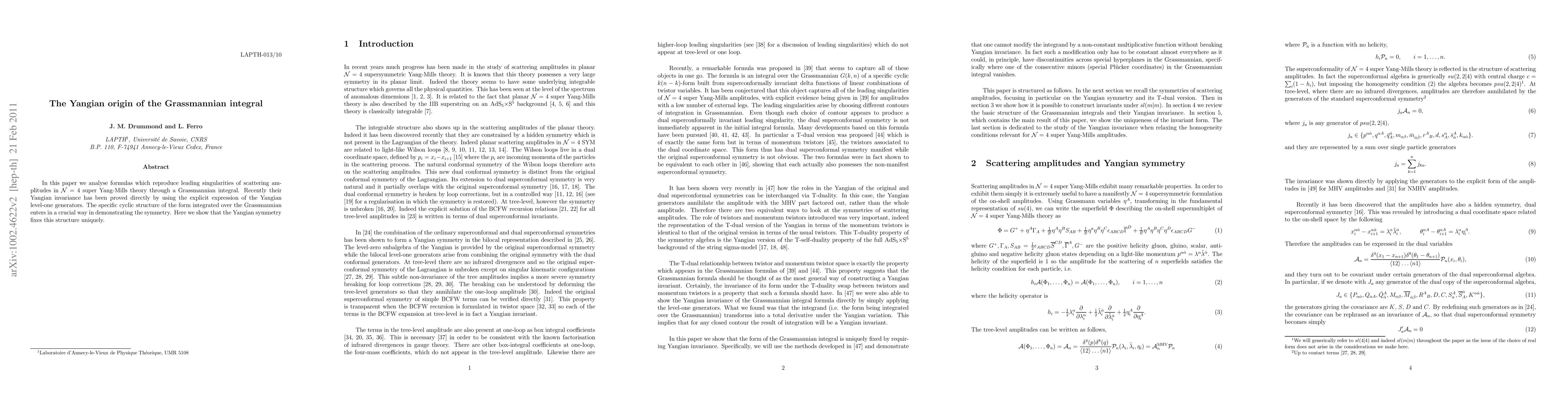 In this paper we analyse formulas which reproduce different contributions to scattering amplitudes in N=4 super Yang-Mills theory through a Grassmannian integral. Recently their Yangian invariance has been proved directly by using the explicit expression of the Yangian level-one generators. The specific cyclic structure of the form integrated over the Grassmannian enters in a crucial way in demonstrating the symmetry. Here we show that the Yangian symmetry fixes this structure uniquely.