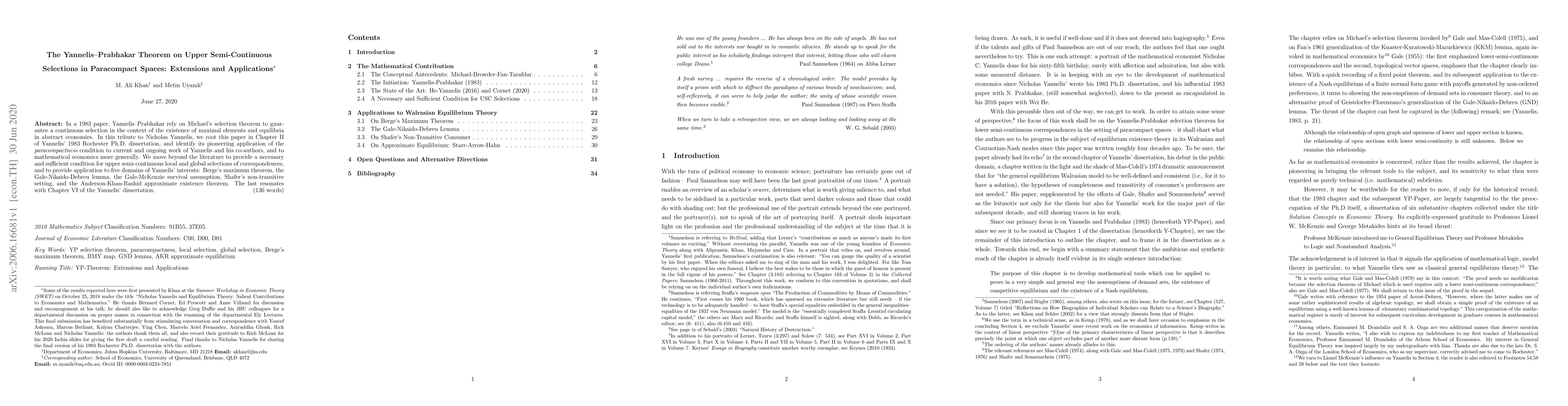In a 1983 paper, Yannelis-Prabhakar rely on Michael's selection theorem to guarantee a continuous selection in the context of the existence of maximal elements and equilibria in abstract economies. In this tribute to Nicholas Yannelis, we root this paper in Chapter II of Yannelis' 1983 Rochester Ph.D. dissertation, and identify its pioneering application of the paracompactness condition to current and ongoing work of Yannelis and his co-authors, and to mathematical economics more generally. We move beyond the literature to provide a necessary and sufficient condition for upper semi-continuous local and global selections of correspondences, and to provide application to five domains of Yannelis' interests: Berge's maximum theorem, the Gale-Nikaido-Debreu lemma, the Gale-McKenzie survival assumption, Shafer's non-transitive setting, and the Anderson-Khan-Rashid approximate existence theorem. The last resonates with Chapter VI of the Yannelis' dissertation.