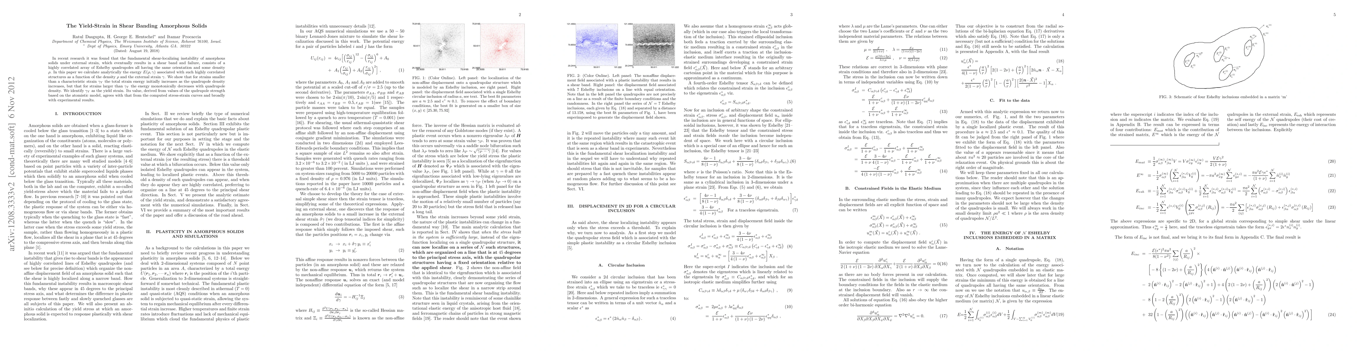 In recent research it was found that the fundamental shear-localizing instability of amorphous solids under external strain, which eventually results in a shear band and failure, consists of a highly correlated array of Eshelby quadrupoles all having the same orientation and some density $\rho$. In this paper we calculate analytically the energy $E(\rho,\gamma)$ associated with such highly correlated structures as a function of the density $\rho$ and the external strain $\gamma$. We show that for strains smaller than a characteristic strain $\gamma_Y$ the total strain energy initially increases as the quadrupole density increases, but that for strains larger than $\gamma_Y$ the energy monotonically decreases with quadrupole density. We identify $\gamma_Y$ as the yield strain. Its value, derived from values of the qudrupole strength based on the atomistic model, agrees with that from the computed stress-strain curves and broadly with experimental results.