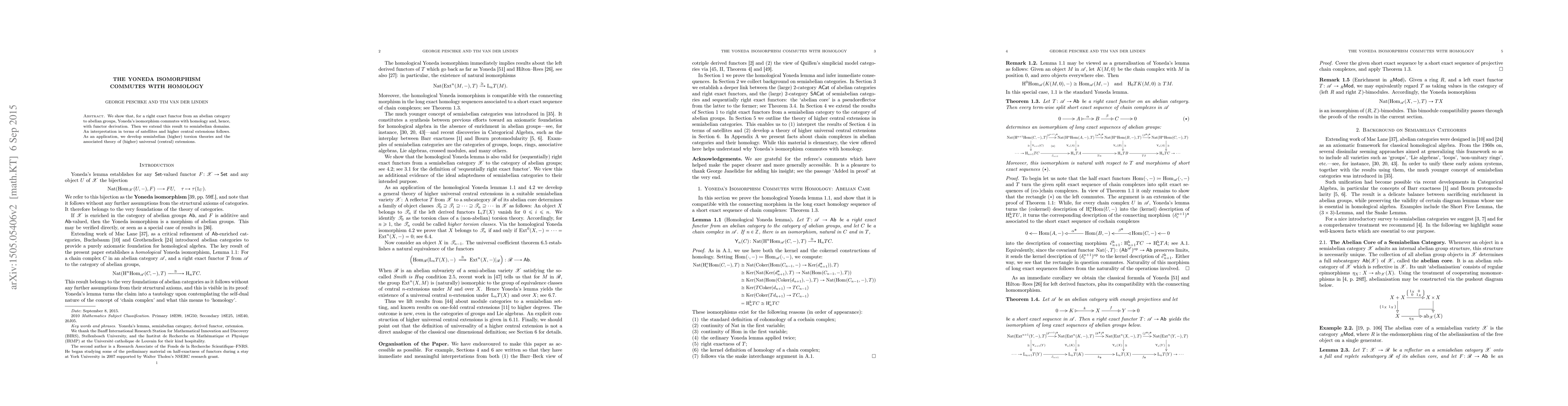 We show that, for a right exact functor from an abelian category to abelian groups, Yoneda's isomorphism commutes with homology and, hence, with functor derivation. Then we extend this result to semiabelian domains. An interpretation in terms of satellites and higher central extensions follows. As an application, we develop semiabelian (higher) torsion theories and the associated theory of (higher) universal (central) extensions.