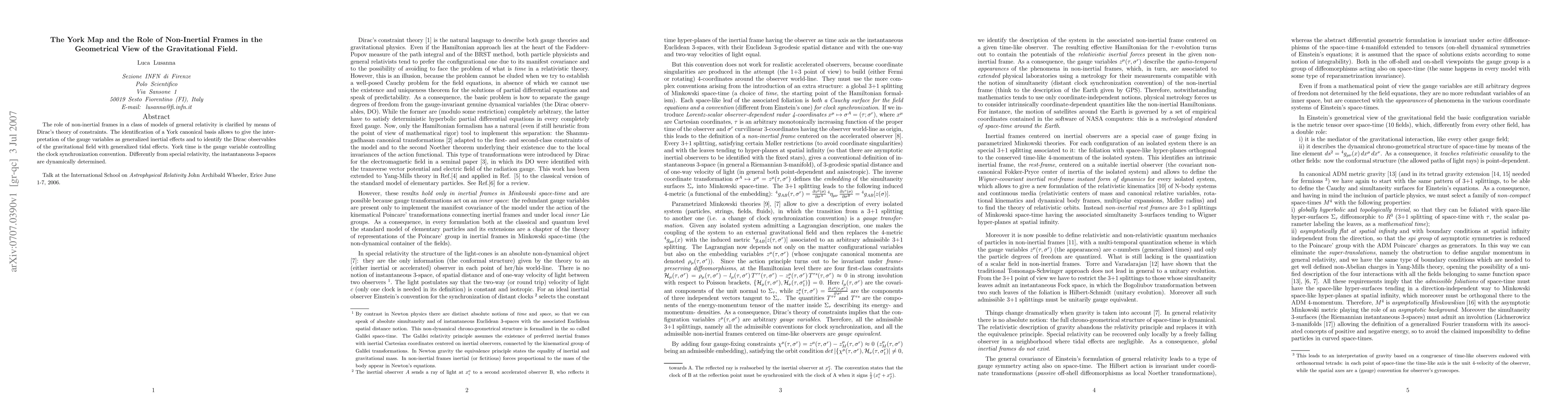 This paper clarifies the role of non-inertial frames in general relativity using Dirac's theory of constraints, identifying York canonical basis to interpret gauge variables as inertial effects and linking Dirac observables to tidal effects. York time governs clock synchronization, with dynamically determined instantaneous 3-spaces differing from special relativity.