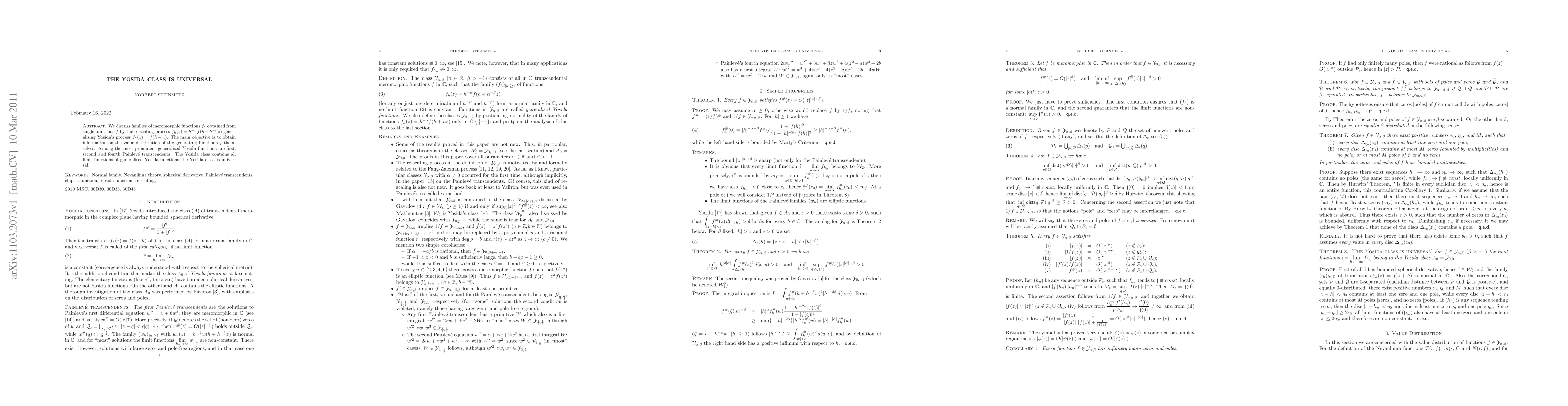We discuss families of meromorphic functions $f_h$ obtained from single functions $f$ by the re-scaling process $f_h(z)=h^{-\alpha}f(h+h^{-\beta}z)$ generalising Yosida's process $f_h(z)=f(h+z)$. The main objective is to obtain information on the value distribution of the generating functions $f$ themselves. Among the most prominent generalised Yosida functions are first, second and fourth Painlev\'e transcendents. The Yosida class contains all limit functions of generalised Yosida functions--the Yosida class is universal.