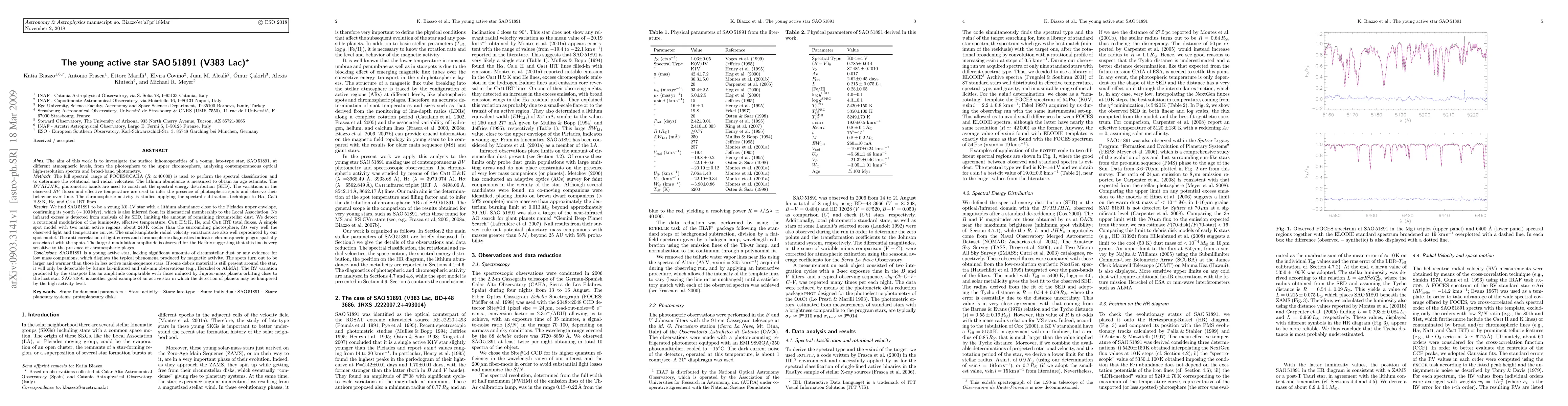 Our aim is investigating surface inhomogeneities of the young late-type star SAO51891, from photosphere to upper chromosphere, analyzing contemporaneous high-resolution spectra and broad-band photometry. The FOCES@CAHA spectral range is used to determine spectral classification and derive vsini and Vrad. The Li abundance is measured to estimate the age. The BVRIJHKs bands are used to construct the SED. The variations of our BV fluxes and Teff are used to infer the presence of photospheric spots and observe their behavior over time. The chromospheric activity is studied applying the spectral subtraction technique to Halpha, CaII H&K, Heps, and CaII IRT lines. We find SAO51891 to be a young K0-1V star with Li abundance close to the Pleiades upper envelope, confirming its youth (~100 Myr), also inferred from its kinematical membership to the Local Association. We detect no IR excess from SED analysis, and rotational modulation of luminosity, Teff, CaII, and Heps total fluxes. A spot model with two active regions, ~240 K cooler than the surrounding photosphere, fits our light/Teff curves, and reproduces the small-amplitude Vrad variations. The anti-correlation of light curves and chromospheric diagnostics indicates plages spatially associated with spots. The large amplitude observed in the Heps-flux curve suggests that this line is very sensitive to the plage presence. Finally, SAO51891 is a young active star, lacking significant amounts of circumstellar dust or any evidence for low mass companions. The spots turn out to be larger and warmer than those in less active MS stars. The Vrad variation produced by spots has an amplitude comparable with those induced by Jupiter-mass planets orbiting close to the star. SAO51891 is a good example of star where the detection of planets may be hampered by the high activity level.