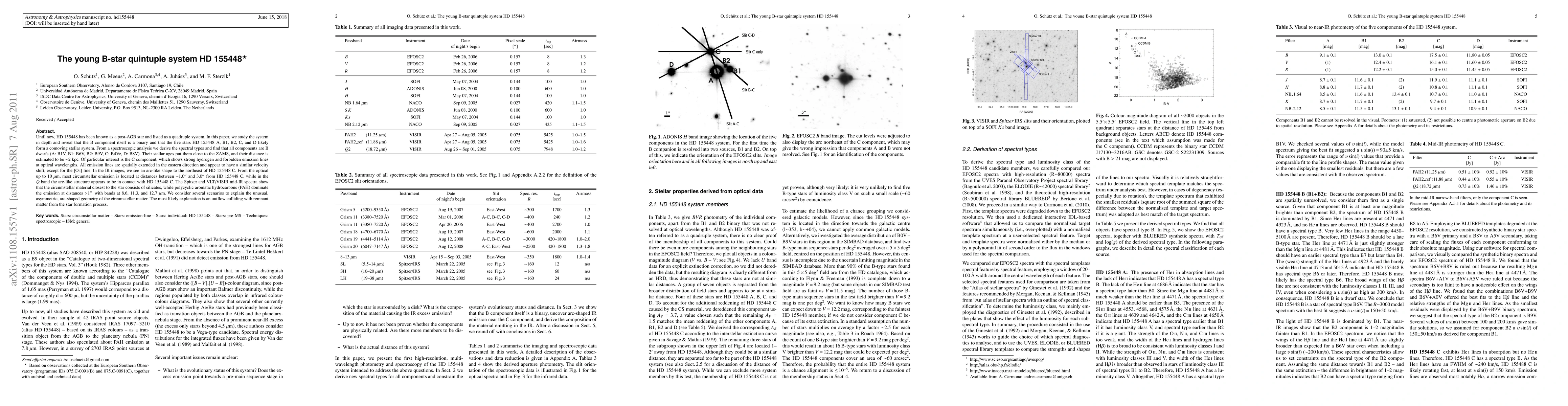 Until now, HD 155448 has been known as a post-AGB star and listed as a quadruple system. In this paper, we study the system in depth and reveal that the B component itself is a binary and that the five stars HD 155448 A, B1, B2, C, and D likely form a comoving stellar system. From a spectroscopic analysis we derive the spectral types and find that all components are B dwarfs (A: B1V, B1: B6V, B2: B9V, C: B4Ve, D: B8V). Their stellar ages put them close to the ZAMS, and their distance is estimated to be ~2 kpc. Of particular interest is the C component, which shows strong hydrogen and forbidden emission lines at optical wavelengths. All emission lines are spatially extended in the eastern direction and appear to have a similar velocity shift, except for the [OI] line. In the IR images, we see an arc-like shape to the northeast of HD 155448 C. From the optical up to 10 micron, most circumstellar emission is located at distances between ~1.0 arcsec and 3.0 arcsec from HD 155448 C, while in the Q band the arc-like structure appears to be in contact with HD 155448 C. The Spitzer and VLT/VISIR mid-IR spectra show that the circumstellar material closest to the star consists of silicates, while polycyclic aromatic hydrocarbons (PAH) dominate the emission at distances >1 arcsec with bands at 8.6, 11.3, and 12.7 micron. We consider several scenarios to explain the unusual, asymmetric, arc-shaped geometry of the circumstellar matter. The most likely explanation is an outflow colliding with remnant matter from the star formation process.