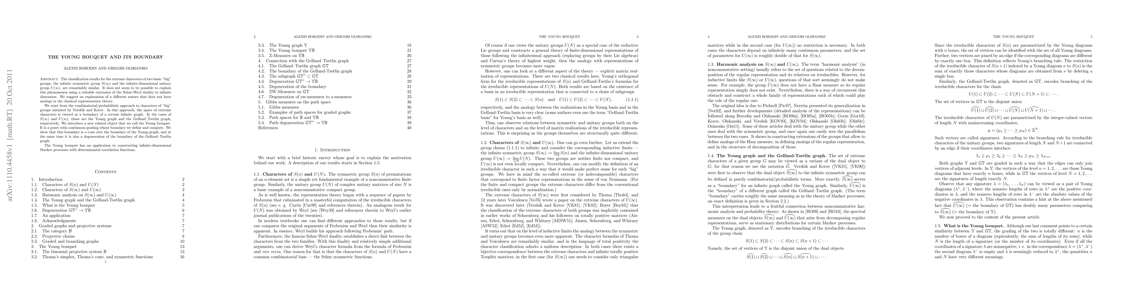 The classification results for the extreme characters of two basic "big" groups, the infinite symmetric group S(infinity) and the infinite-dimensional unitary group U(infinity), are remarkably similar. It does not seem to be possible to explain this phenomenon using a suitable extension of the Schur-Weyl duality to infinite dimension. We suggest an explanation of a different nature that does not have analogs in the classical representation theory. We start from the combinatorial/probabilistic approach to characters of "big" groups initiated by Vershik and Kerov. In this approach, the space of extreme characters is viewed as a boundary of a certain infinite graph. In the cases of S(infinity) and U(infinity), those are the Young graph and the Gelfand-Tsetlin graph, respectively. We introduce a new related object that we call the Young bouquet. It is a poset with continuous grading whose boundary we define and compute. We show that this boundary is a cone over the boundary of the Young graph, and at the same time it is also a degeneration of the boundary of the Gelfand-Tsetlin graph. The Young bouquet has an application to constructing infinite-dimensional Markov processes with determinantal correlation functions.