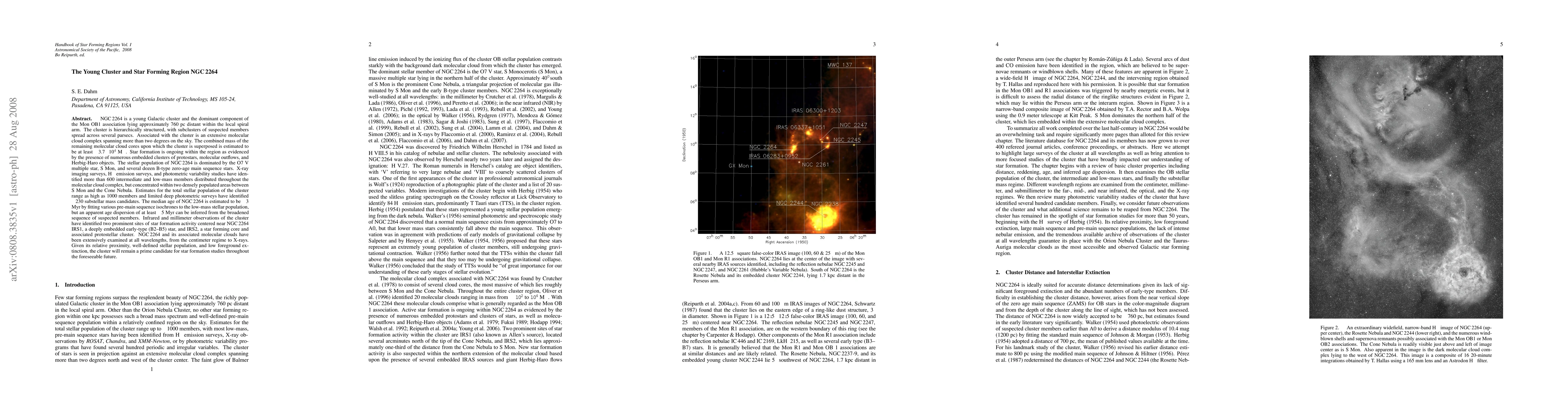 NGC 2264 is a young star-forming cluster in the Mon OB1 association, approximately 760 pc away, featuring a hierarchical structure and ongoing star formation. It hosts over 600 stars and 230 substellar candidates, with prominent star formation sites near NGC 2264 IRS1 and IRS2.