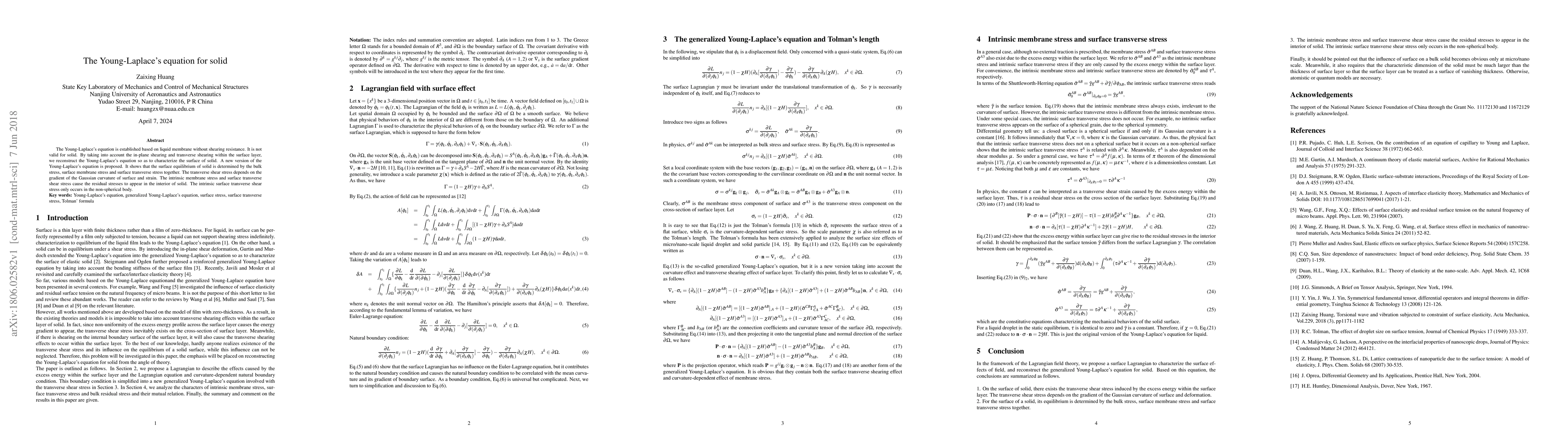 The Young-Laplace's equation is established based on liquid membrane without shearing resistance. It is not valid for solid. By taking into account the in-plane shearing and transverse shearing within the surface layer, we reconstruct the Young-Laplace's equation so as to characterize the surface of solid. A new version of the Young-Laplace's equation is proposed. It shows that the surface equilibrium of solid is determined by the bulk stress, surface membrane stress and surface transverse stress together. The transverse shear stress depends on the gradient of the Gaussian curvature of surface and strain. The intrinsic membrane stress and surface transverse shear stress cause the residual stresses to appear in the interior of solid. The intrinsic surface transverse shear stress only occurs in the non-spherical body.