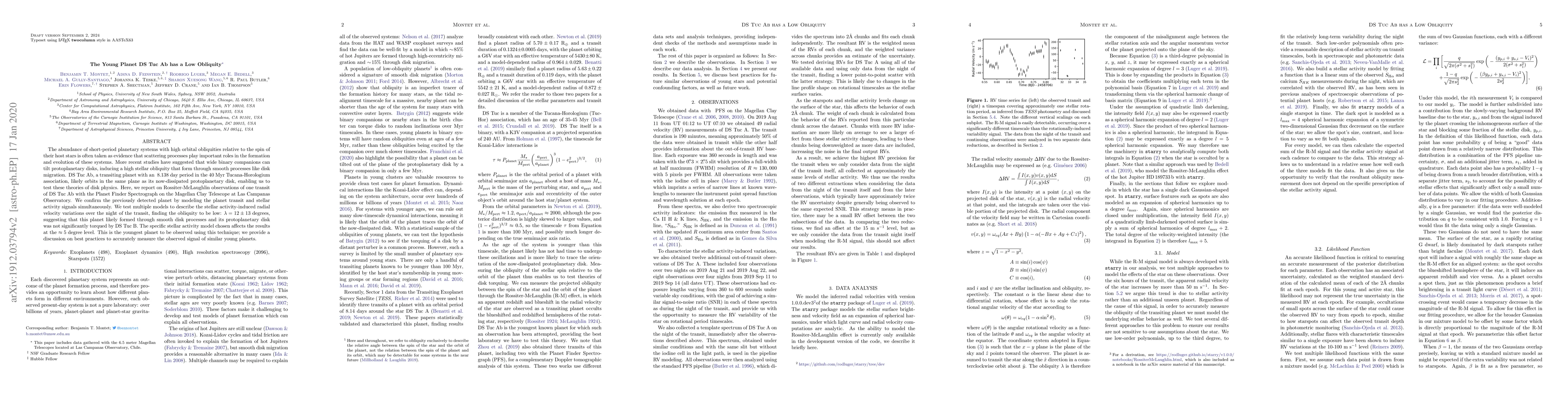 A young planet, DS Tuc Ab, with a low orbital obliquity of 12 degrees suggests it formed through smooth disk processes, not scattering or wide binary companions.