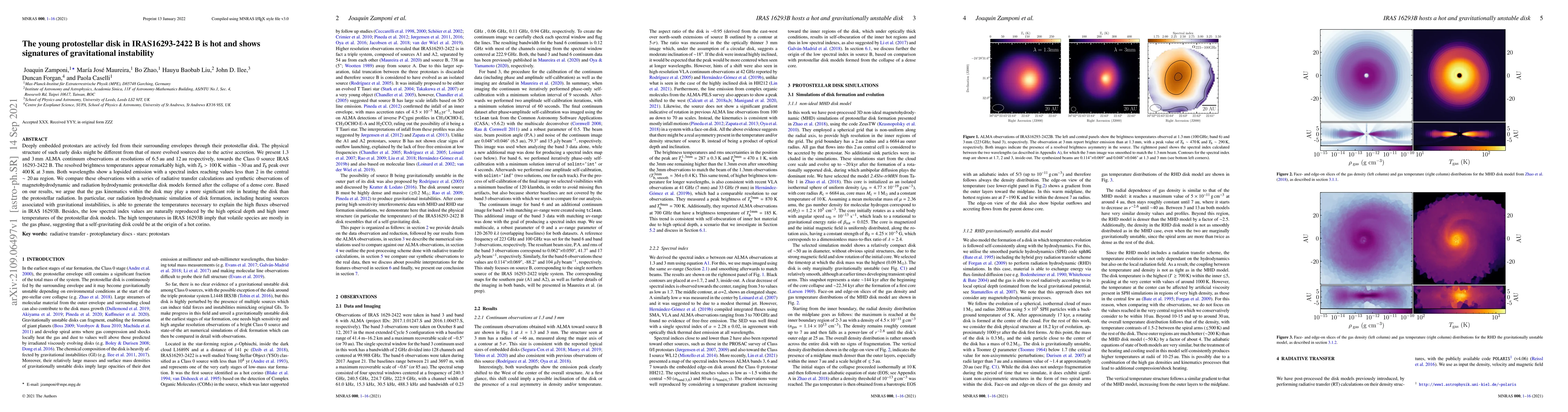 Deeply embedded protostars are actively fed from their surrounding envelopes through their protostellar disk. The physical structure of such early disks might be different from that of more evolved sources due to the active accretion. We present 1.3 and 3\,mm ALMA continuum observations at resolutions of 6.5\,au and 12\,au respectively, towards the Class 0 source IRAS 16293-2422 B. The resolved brightness temperatures appear remarkably high, with $T_{\rm b} >$ 100\,K within $\sim$30\,au and $T_{\rm b}$ peak over 400\,K at 3\,mm. Both wavelengths show a lopsided emission with a spectral index reaching values less than 2 in the central $\sim$ 20\,au region. We compare these observations with a series of radiative transfer calculations and synthetic observations of magnetohydrodynamic and radiation hydrodynamic protostellar disk models formed after the collapse of a dense core. Based on our results, we argue that the gas kinematics within the disk may play a more significant role in heating the disk than the protostellar radiation. In particular, our radiation hydrodynamic simulation of disk formation, including heating sources associated with gravitational instabilities, is able to generate the temperatures necessary to explain the high fluxes observed in IRAS 16293B. Besides, the low spectral index values are naturally reproduced by the high optical depth and high inner temperatures of the protostellar disk models. The high temperatures in IRAS 16293B imply that volatile species are mostly in the gas phase, suggesting that a self-gravitating disk could be at the origin of a hot corino.